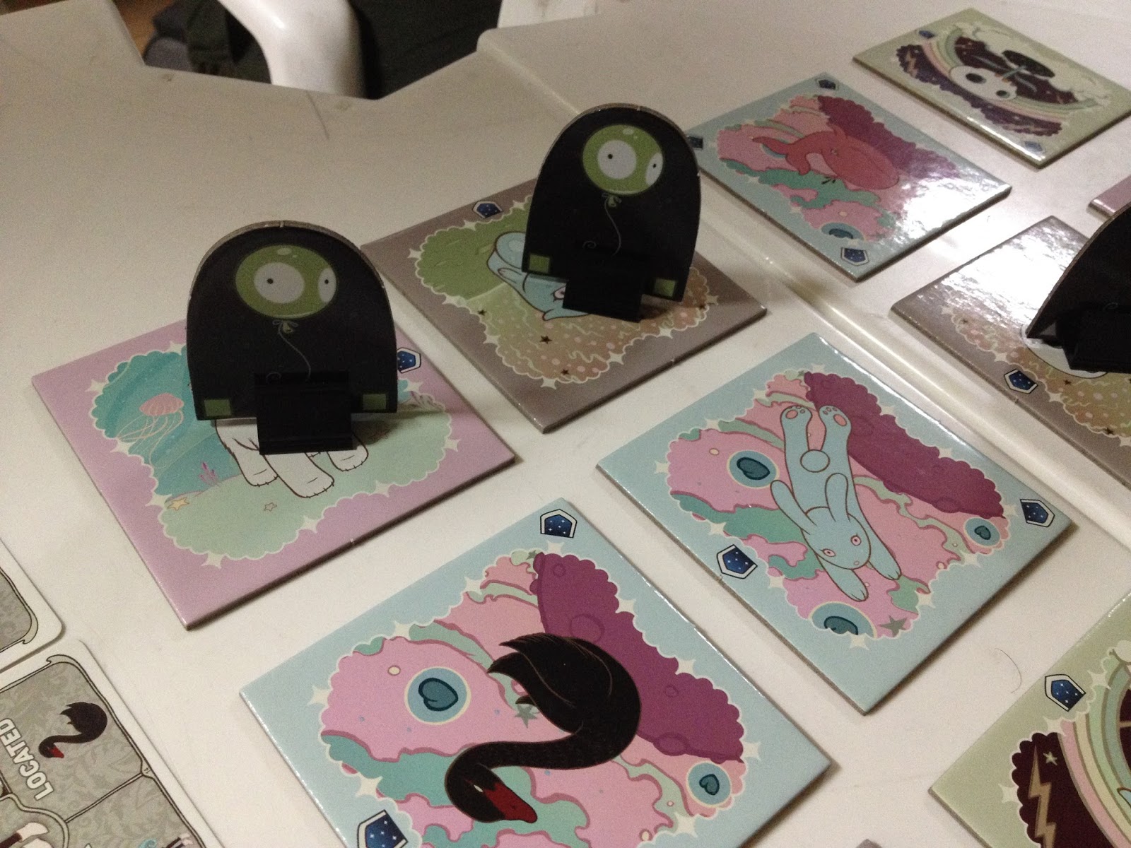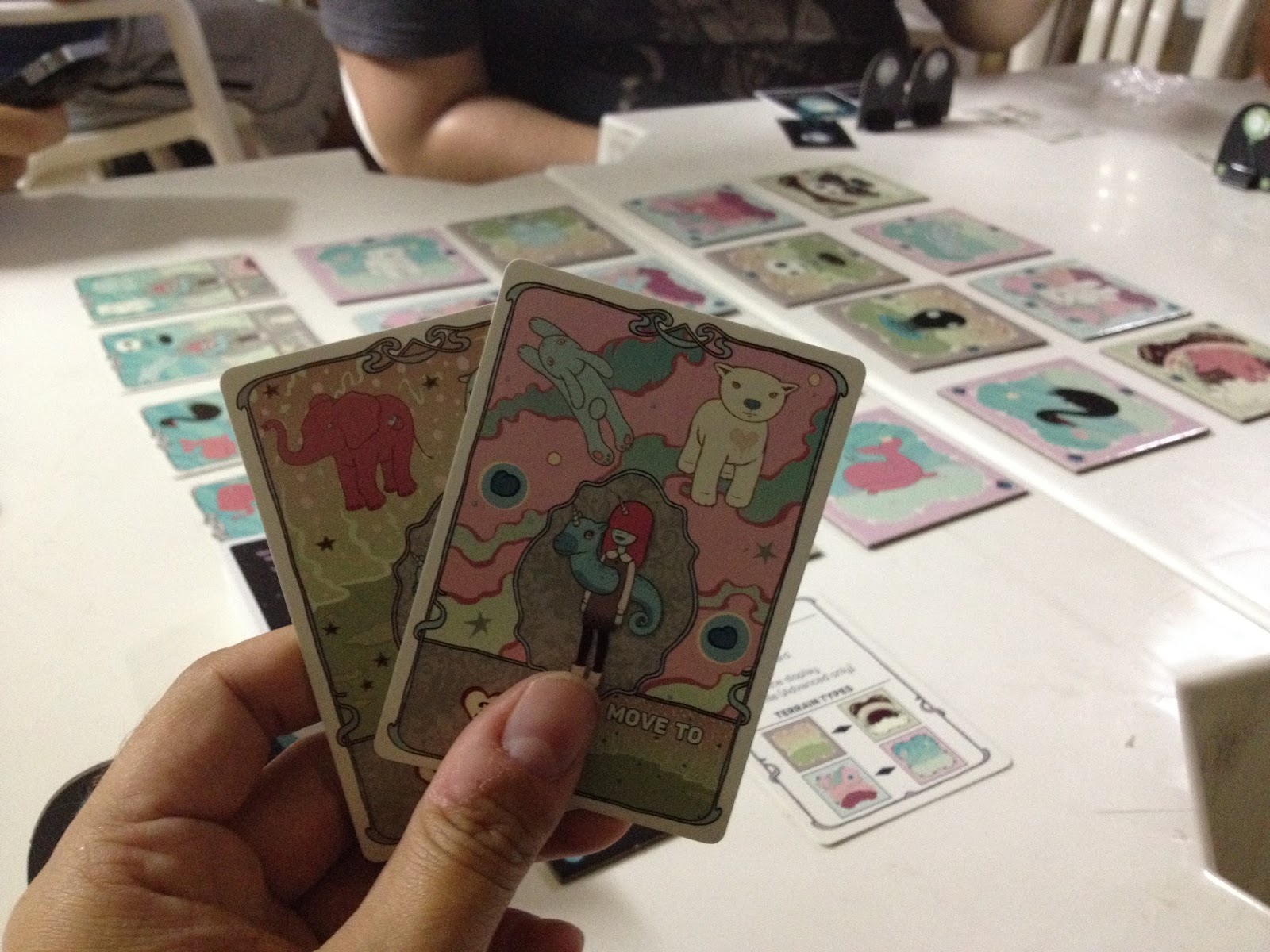 Na nossa rodada cada jogador tem três ações para gastar entre cinco possíveis, que são : comprar uma carta, colocar novas cartas no display, rotacionar um tile, jogar uma carta de amiguinho ou mover-se entre os tiles.