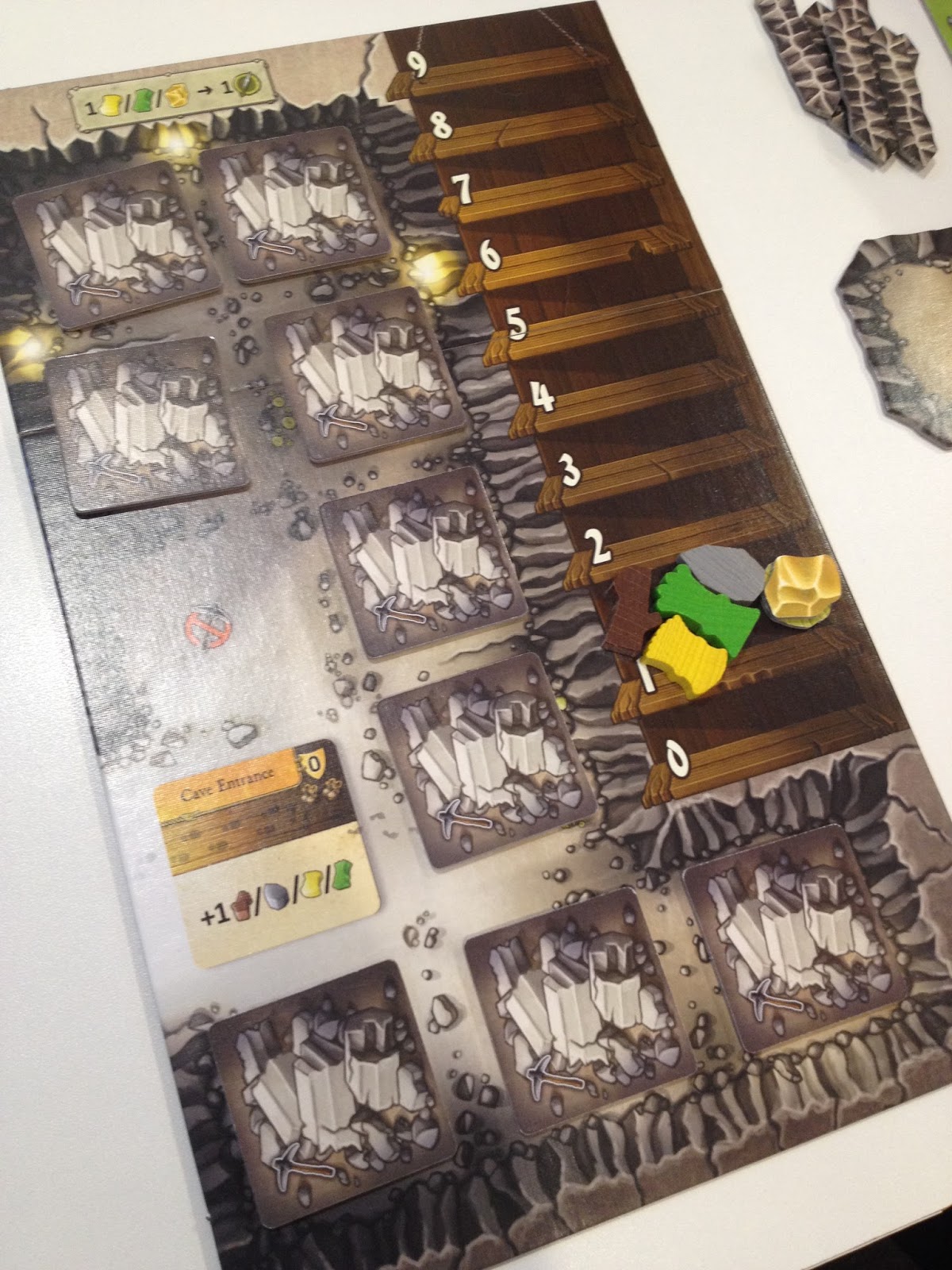 No "Caverninha" temos o display de ações, cada jogador começa com uma caverna com dois espaços já descobertos (sendo que com uma sala já funcionando) e mais nove espaços a serem escavados.