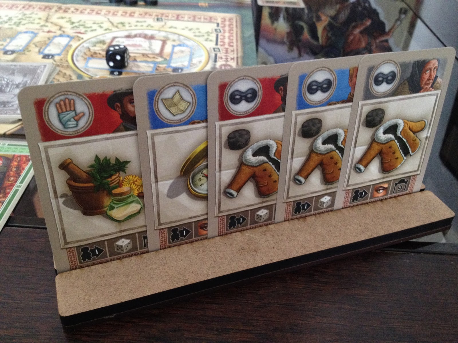 A outra ação é tentar se livrar dos perigos da sua trilha de viagem, e para isso você gasta cartas da sua mão, obedecendo uma ordem, você pode gastar uma carta com o mesmo ícone do perigo, ou duas cartas iguais mas com ícone diferente do perigo a ser descartado, e ao descartar esses perigos, como recompensa, você pega uma dessas cartas descartadas e ganha um benefício permanente.