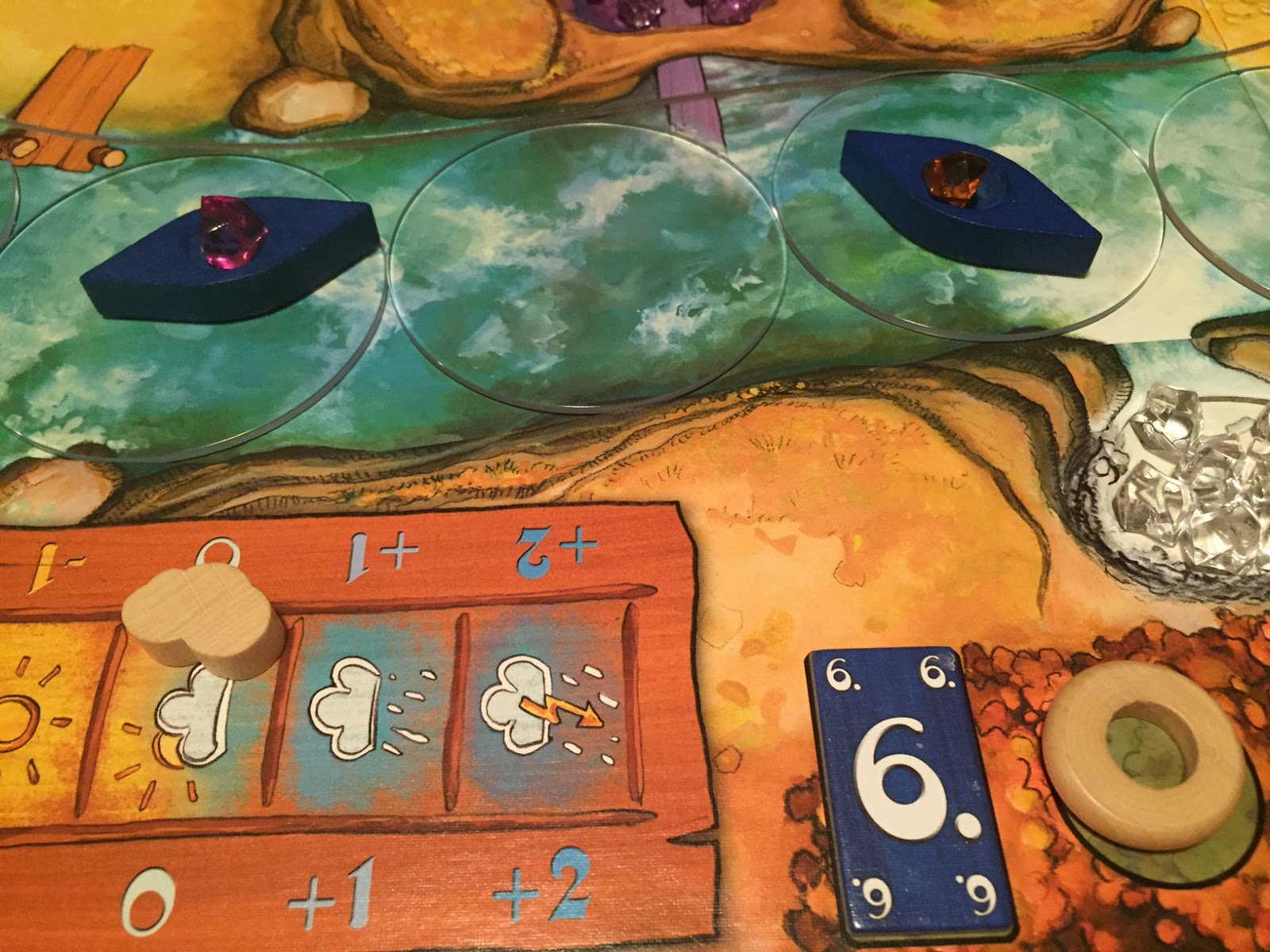 Dentre todas as fichas jogadas, o rio vai se mover a quantidade de espaços do menor valor, com o modificador de nuvem que estiver ativo (começa em 0 mas pode ir alterando com as fichas), e seus barquinhos vão chegar cada vez mais próximos das cataratas e até mesmo cair nelas.