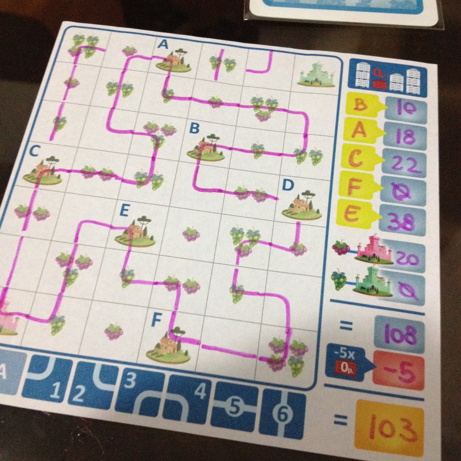 Na preparação do jogo, cada jogador pega uma folhinha de mapa e algo para escrever nele, nos mapas nos temos um grid de 6x7 onde temos desenhadas 6 fazendas, 2 castelos e um monte de uvas verdes e rosa.