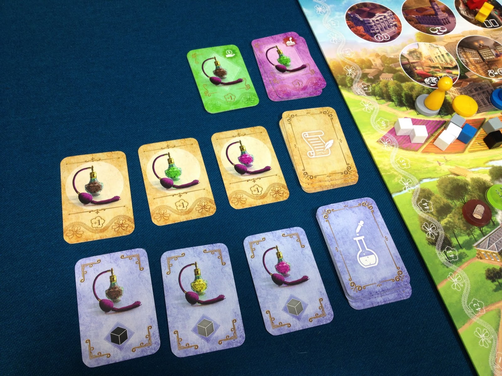 No setup inicial, cada jogador coloca três fichas da sua cor na trilha de mercado, as que não tiverem cor de nenhum jogador, recebem uma ficha cinza, então na vez de mover o peão, caso você caia na casa da sua cor, pega até dois componentes para os perfumes, na casa neutra pega um e na casa da cor de algum adversário pode pegar um componente pagando uma moeda para o dono do espaço.