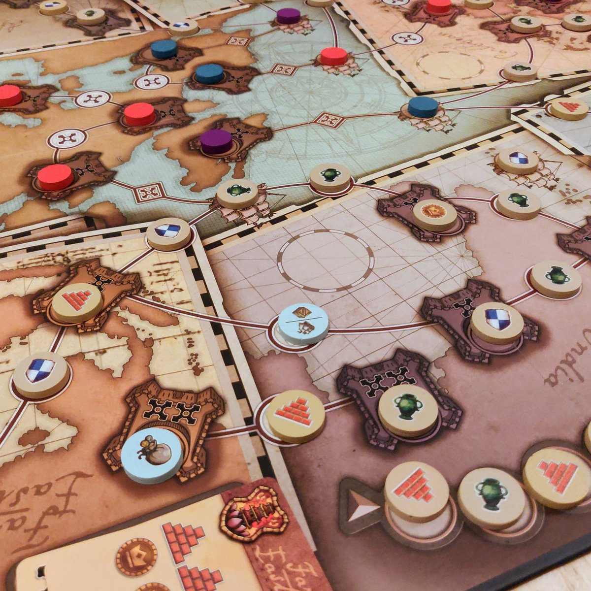 O Tabuleiro principal representa a Terra, com todos seus continentes. Cada jogador tem seu Tabuleiro Individual, onde marca o nível de suas trilhas de Tecnologia, População, Riqueza e Cultura, além de colocar sus Prédios construídos, Cartas de Comércio e Trabalhadores. No início dap partida são colocados aleatoriamente no Tabuleiro Central marcadores, em cada Cidade e nas Trilhas de Navegação dos continentes.