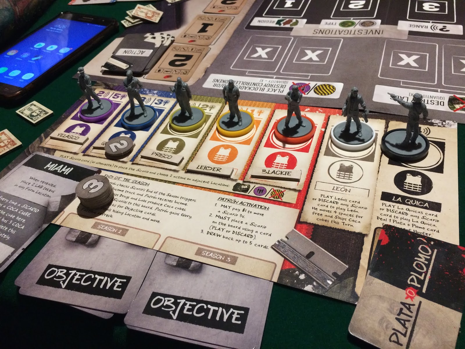 Mas tem dois aspectos que para mim foram negativos, o jogo se estende muito, acho que ele deveria fechar em três temporadas, pois se ninguém vence ao final da terceira fica até estranho para o "Patron" abrir um quarto objetivo (não tem nem espaço no tabuleiro), e outra coisa que vem inerente a esse tipo de jogo, é que o jogador que controla o Pablo (ou o Dracula, ou o Mister X) acaba parecendo que tá se divertindo mais e acaba gerando um AP muito grande, então em vários momentos você fica com aquela sensação de coadjuvante.