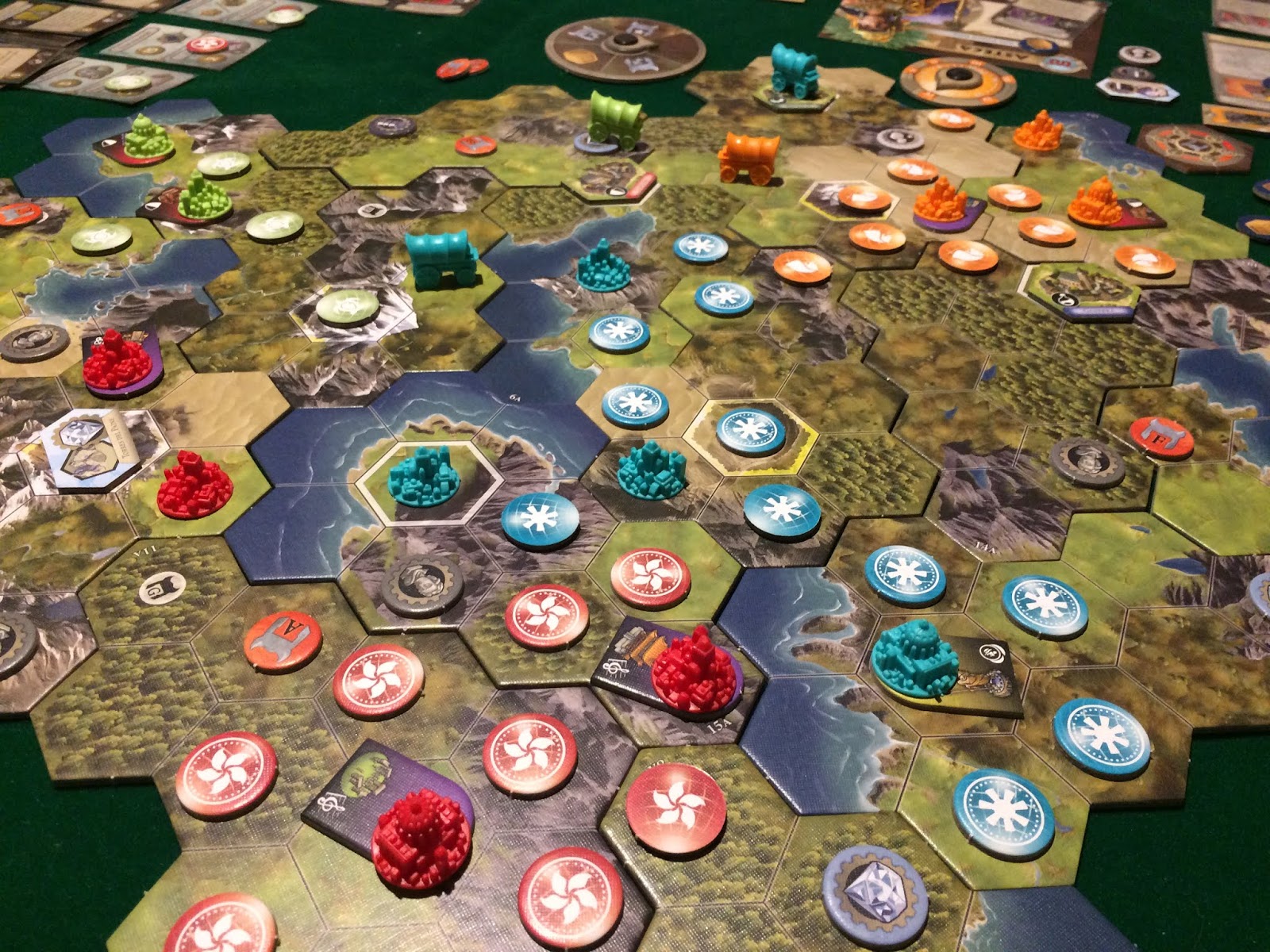 Outra simplificação em relação aos jogos anteriores, foi o crescimento tecnológico das civilizações. Nessa nova versão você tem um disco que vai avançando conforme você usa a ação de ciência, ao passar por determinados valores você pode fazer upgrades nas ações, mas durante a partida inteira você só precisa se preocupar em crescer para a Era II, III e IV duas vezes cada ação, então fica mais fácil ter controle e pensar numa estratégia.