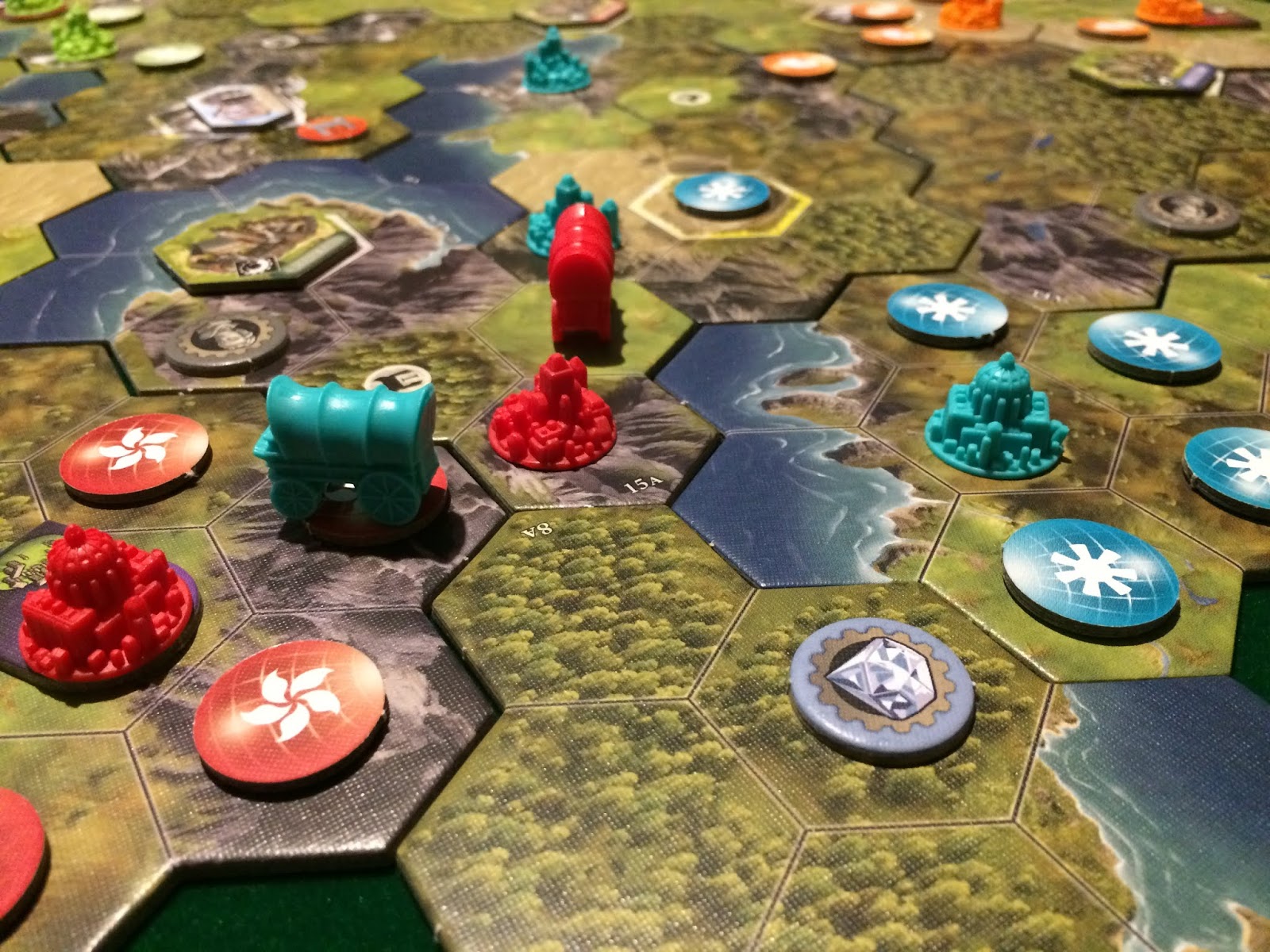 Outra simplificação em relação aos jogos anteriores, foi o crescimento tecnológico das civilizações. Nessa nova versão você tem um disco que vai avançando conforme você usa a ação de ciência, ao passar por determinados valores você pode fazer upgrades nas ações, mas durante a partida inteira você só precisa se preocupar em crescer para a Era II, III e IV duas vezes cada ação, então fica mais fácil ter controle e pensar numa estratégia.