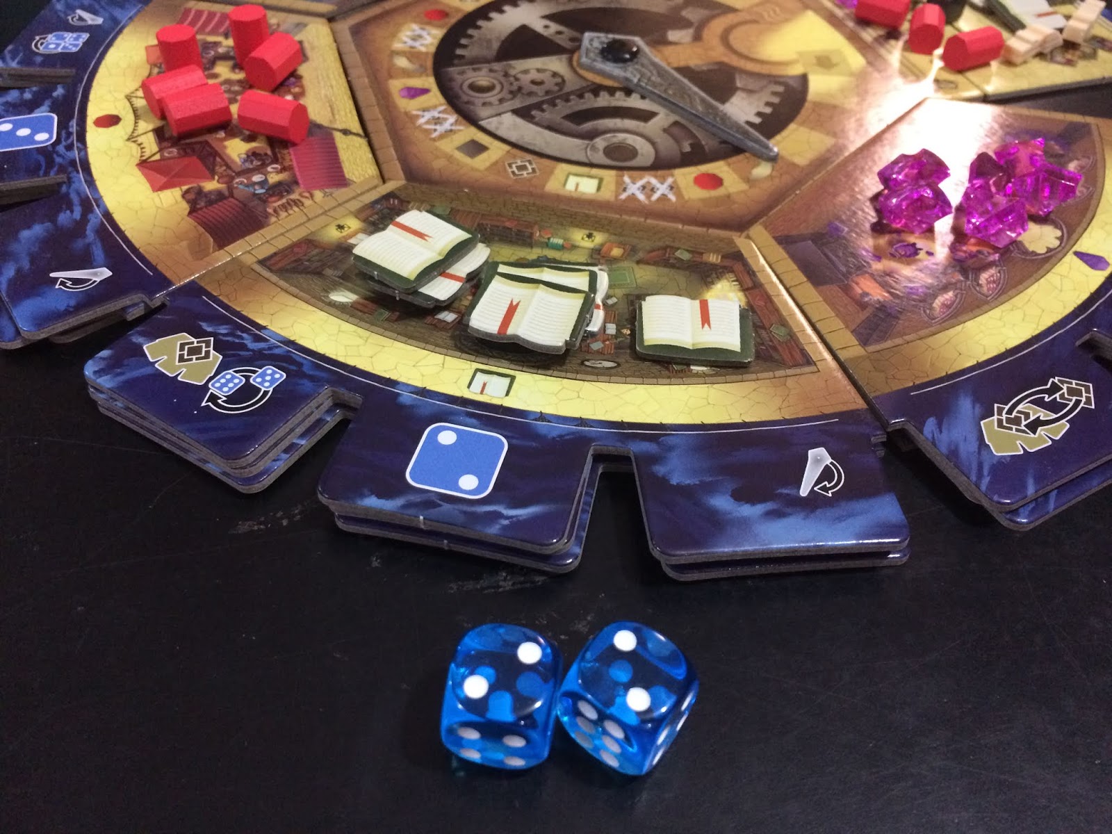 Depois de todos os jogadores terem pego dois dados, sempre sobra um dadinho no tabuleiro, em cada região tem uma quantidade (de 1 a 3) para o avanço do relógio que indica o final do jogo, então o valor onde ficou esse último dado é avançado e se houver algum símbolo ele é resolvido (geralmente mais uma forma de pontuação).