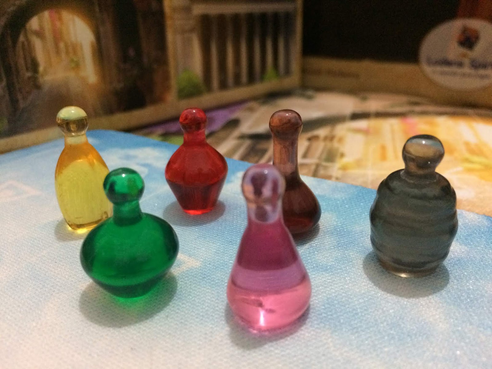Mas o produto final ficou excelente e mais uma vez destaco os frasquinhos dos perfumes, diferentes para cada fragrância e que realmente complementam demais um jogo que já era super temático.