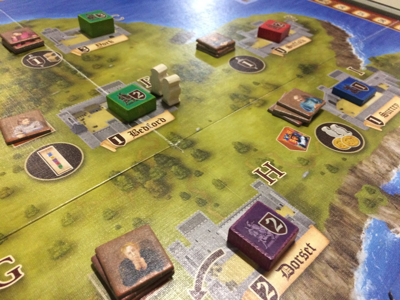Já nos espaços no condado tem uma força mínima dos cavaleiros para que você possa alocar sua peça, mas essa força pode ser aumentada com o reforço de escudeiros que junto ao nível do cavaleiro determinam a sua força naquele espaço.