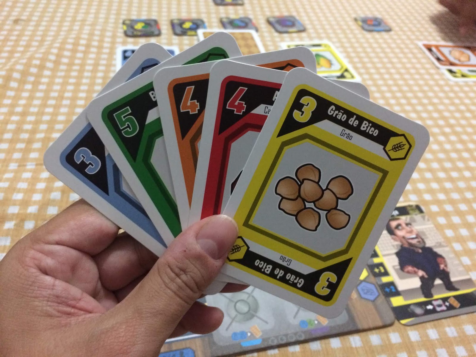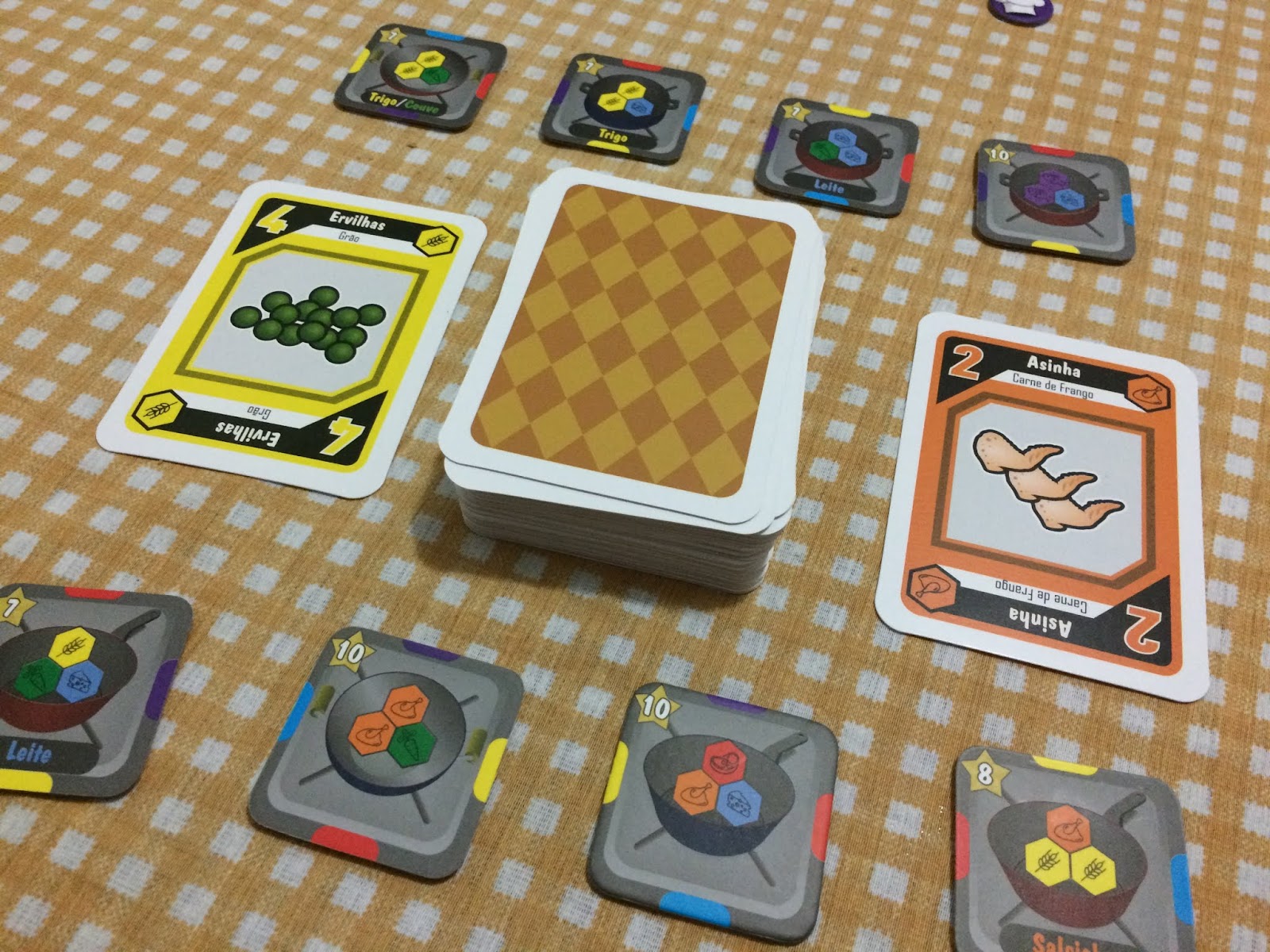 Então à partir do chef da rodada, cada jogador vai escolher um dos pratos disponíveis, pagando o seu custo em ingredientes, mas o jogo é bem tranquilo na questão de não tê-los, pois você pode pagar uma carta qualquer para usar ingredientes do balcão dos amiguinhos ou até mesmo gastar duas cartas quaisquer para repor algum que você não tenha.