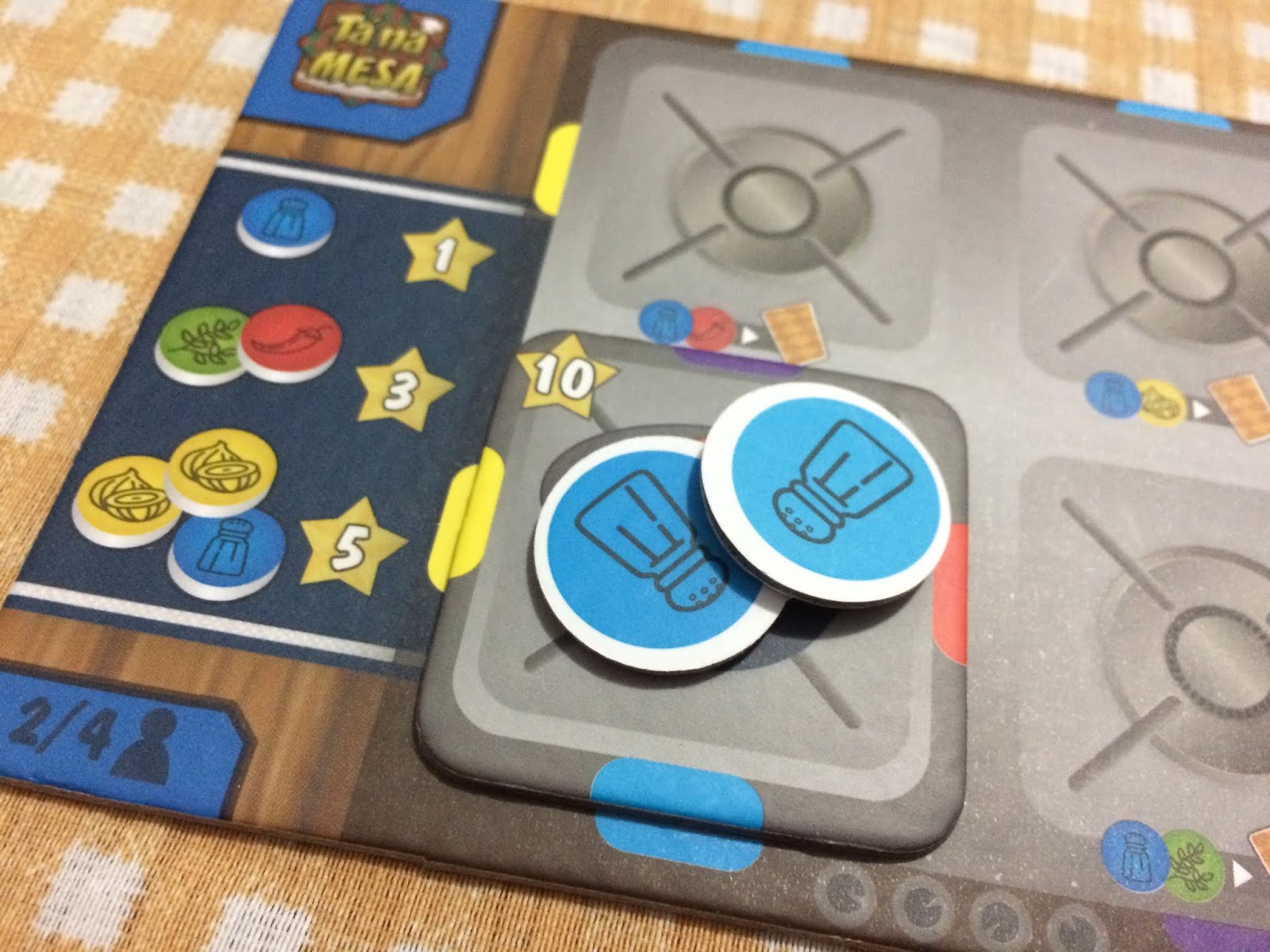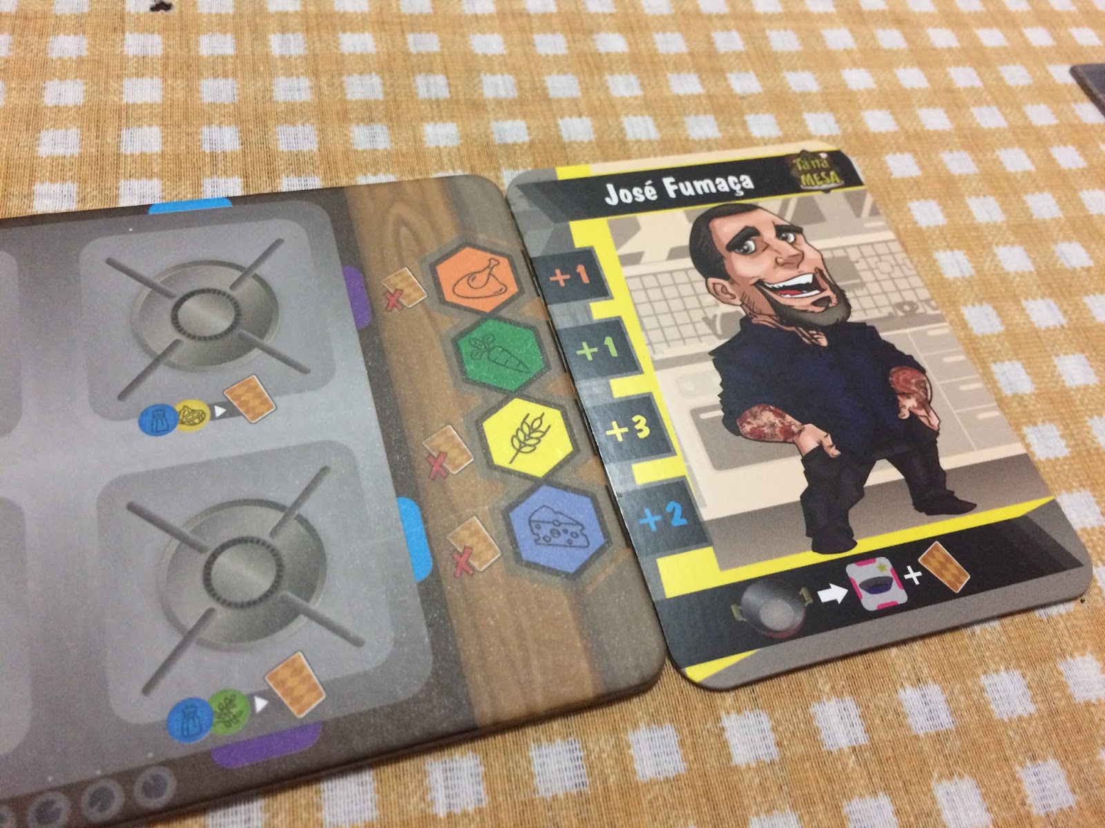 Feito isso, primeiro os jogadores verificam se usaram algum ingrediente especial que o prato pede, o que lhe garante pontinhos na hora, e depois soma os valores e os coloca em uma trilha especial, quem tiver o maior somatório também recebe uns pontinhos (já o menor perde uma carta).