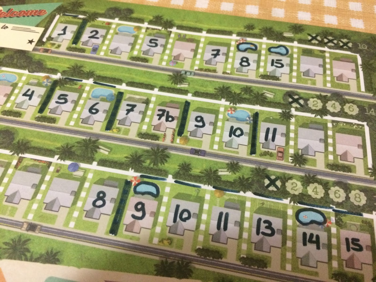Cada cidade é composta por três ruas, você precisa colocar a numeração sempre de forma crescente, isto é, você não pode anotar uma casa 10 antes de uma casa 9, mas você não precisa escolher os números em sequência, então você pode ir anotando de forma desordenada deixando espaços para serem preenchidos posteriormente e pulando números, desde que no final das contas as casas estejam em ordem crescente.