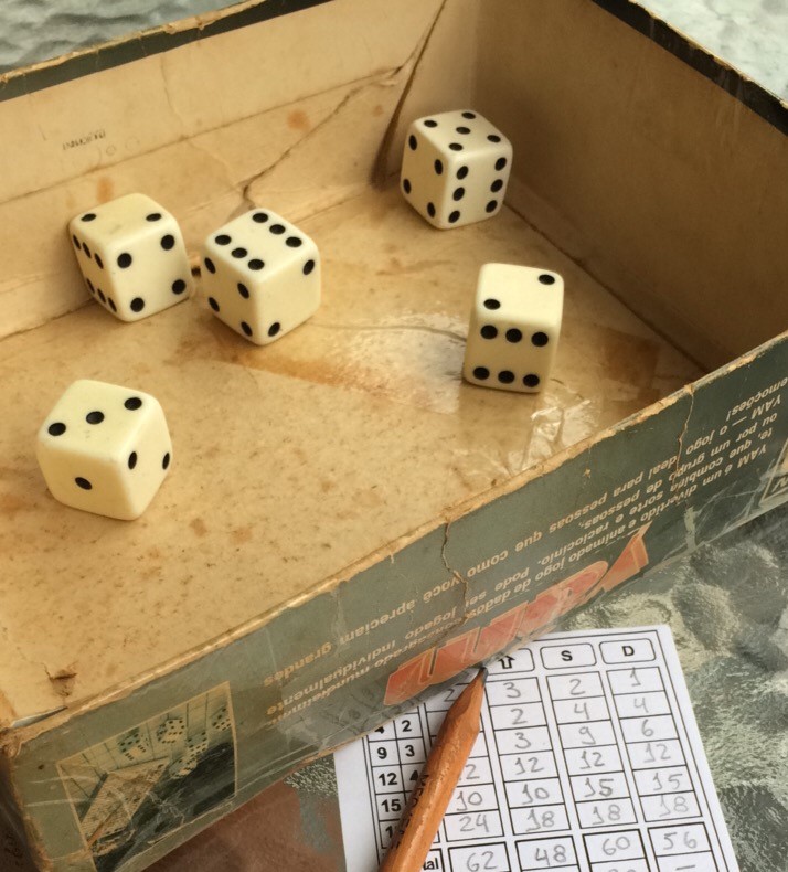 Além disso as pontuações são diferentes: uma quadra de 1, no Yam dão 24 pontos (20 + 4x1), no Yahtzee dá o total dos 5 dados e isso vale o mesmo para a trinca (que não tem no Yam).