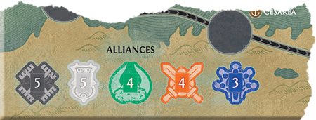 As outras ações são novas. Recrutamento traz as famosas Legiões Romanas ao jogo (Nota do Sr. Slovic: São meeples no formato de um centurião. Bem legal). Só é possível recrutar em cidades com fortes, ou como ação especial de alguns personagens, como no caso do Consul. As tropas podem se movimentar, mas só junto com um personagem. Os legionários servem para ataque e defesa. Quando um personagem está em uma cidade com Legiões e Bárbaros, ele pode fazer a ação de Ataque. Joga-se um dado por tropa (no máximo 3). As faces apresentam símbolos de cubos (os bárbaros são derrotados), de tropa (legionários são derrotados) e da Águia que é uma ação especial descrita no cartão do personagem, sendo que cada um é diferente. Bárbaros e tropas derrotadas saem do tabuleiro, mas não do jogo, voltando para o Estoque. Por fim, quando uma Aliança é feita, é possível Alistar Bárbaros. Gastando uma carta da cor da tribo numa cidade que tenha pelo menos um cubo da tribo em questão, todos os cubos da cor escolhida, naquela cidade, são substituídos por Legiões.