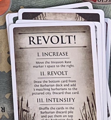 No início do jogo e no fim de cada turno, uma determinada quantidade de Cartas de Invasão são compradas, indicado onde os tribos vão entrar no jogo (Nota do Sr. Slovic: Assim como as Cartas de Infecção). A quantidade de cubos é determinada pelo Nível de Revolta, variando de dois a cinco. Sempre que uma Carta de Revolta é comprada, ela deve ser resolvida imediatamente. Os efeitos são: Elevar em um o nível de Revolta, Comprar a última Carta de Invasão e colocar três cubos na cidade e, por fim, embaralhar todas as Cartas de Revolta do descarte, colocando-as sobre a Pilha de Invasão. Ou seja, todas as cartas que já foram usadas vão voltar, aumentando a quantidade de Bárbaros nesses locais. Quando um quarto cubo, da mesma cor, entra numa cidade, ocorre um Saque. O nível de Declínio aumenta em um e em todas as cidades adjacentes entra um cubo, o que pode ocasionar novos Saques.