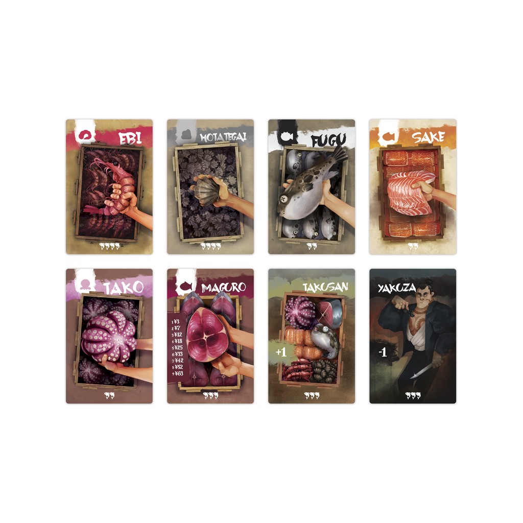 As cartas representam diferentes tipos de pescados comercializados em Tsukiji: Tako (Polvo), Hotategai (Vieira), Ebi (Camarão), Fugu (Baiacu) e Sake (Salmão). São essas cartas que sofrem com a especulação e variação de preço. Já o Maguro (Atum), Takusan e a carta de Yakuza, não são afetadas pelo mercado. Antes de iniciar a partida, deve-se determinar a cotação inicial de cada produto, aleatoriamente, colocando o marcador no Tabuleiro de Mercado.