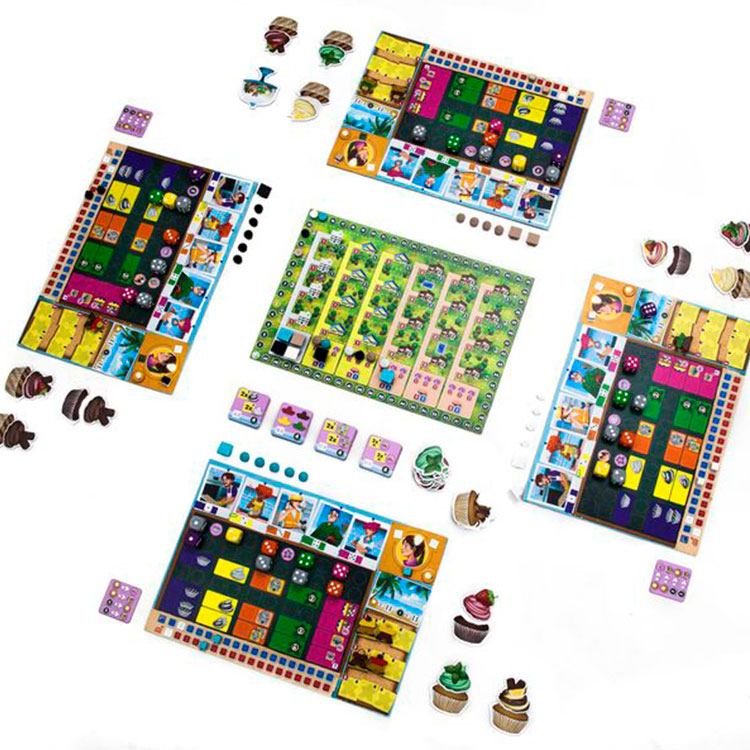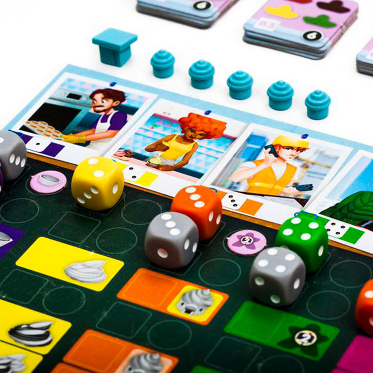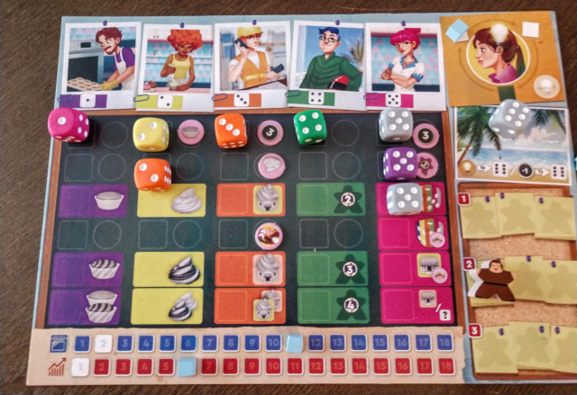 Cada jogador tem um Tabuleiro Individual que representa sua Padaria. Temos vários especialistas, um para cada tipo de ação: Fazer Massa, Fazer Cobertura, Construir Quiosques, Entregar e Gerenciar, cada um representado por um dado colorido (Roxo, Amarelo, Laranja, Verde e Rosa, respectivamente), além de três dados cinzas. Cada ação também está relacionada a um dos números dos dados. Quando os dados são lançados, o jogador coloca-os nas colunas conforme o número que saiu (Nota do Sr. Slovic: Nesse momento ignore a cor. Isso é bem importante). Quando se usa uma determinada ação, sua força é igual ao número de dados nela (Nota da Sra. Slovic: Igual a Grand Austria Hotel). Cada coluna está dividida em seis linhas, onde são alocados os dados. Exceto pela coluna da Gerência, as linhas três, cinco e seis indicam uma ação, o que significa que para fazer essa ação são necessários pelo menos aquela quantidade de dados.