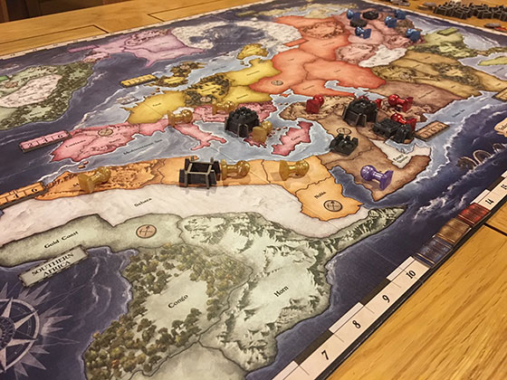 O tabuleiro do jogo é dividido em 13 regiões e cada região é dividida em vários territórios. Alguns desses territórios, que estão pintados de branco, são considerados inóspito, onde nenhum exército pode passar, a não ser que lá tenha um marcador de Caravana.