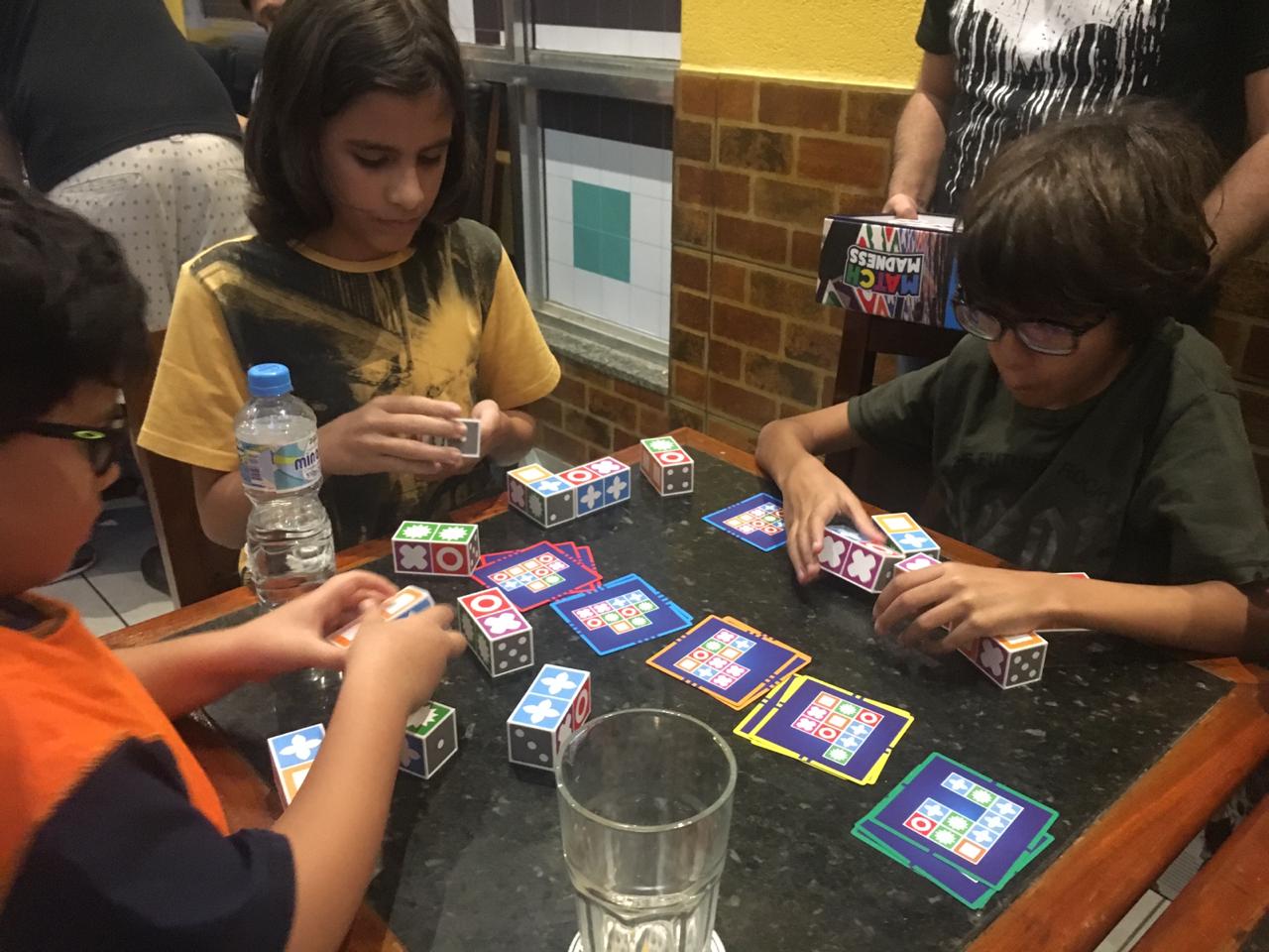 Match Madness é um jogo de destreza e observação onde os jogadores tem cinco blocos com padrões que precisam ser combinados para que fiquem iguais as cartas apresentadas no meio da mesa, quanto mais rápido mais chances de pegar mais pontos.