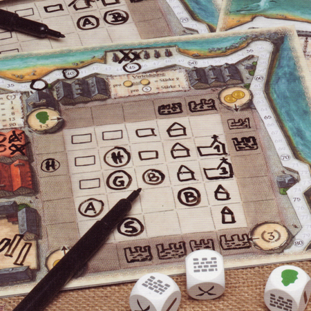 Nele temos uma cidade fortificada, e com as nossas rolagens vamos construindo prédios, canhões e provisões para quando os piratas atacarem estarmos bem preparados para rechaçar o inimigo, e ainda conseguir uns pontinhos extra.