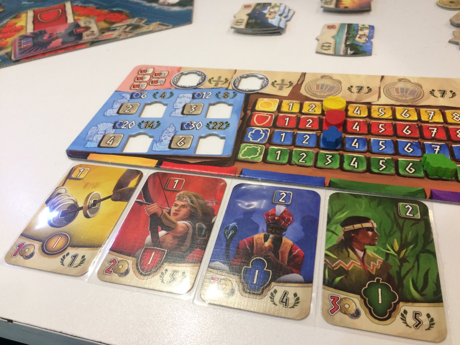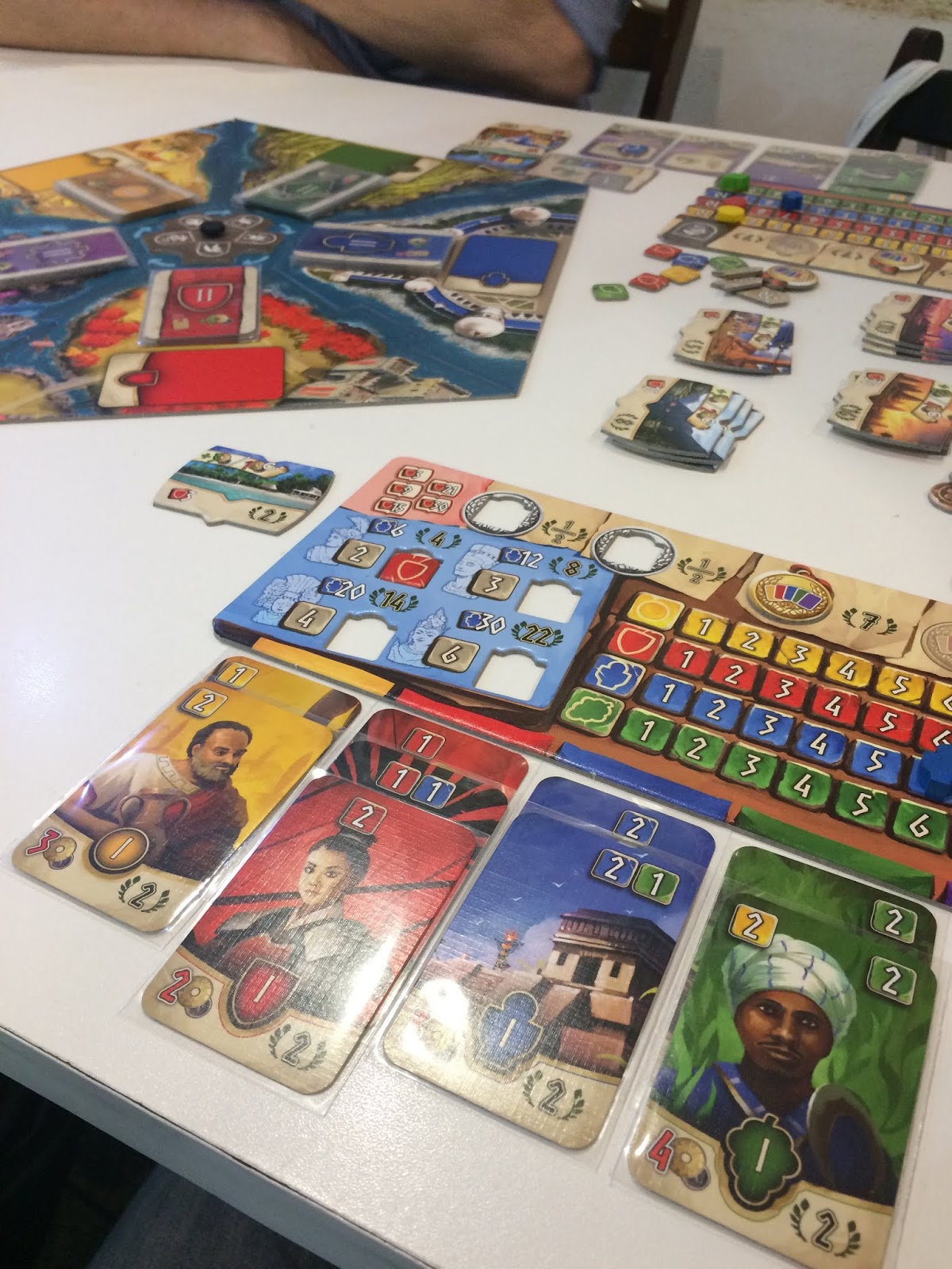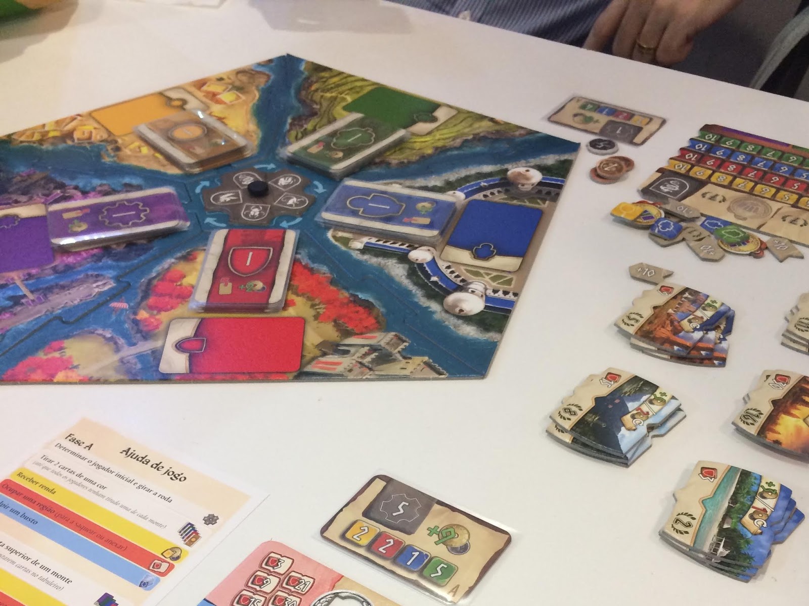 Esse "draft" vai acontecendo até que todas as cartas fechadas tenham sido compradas, aí temos um intervalo onde recebemos moedas, podemos anexar ou pilhar territórios e esculpimos bustos (que podem dar pontos ou aumentar alguma trilha).