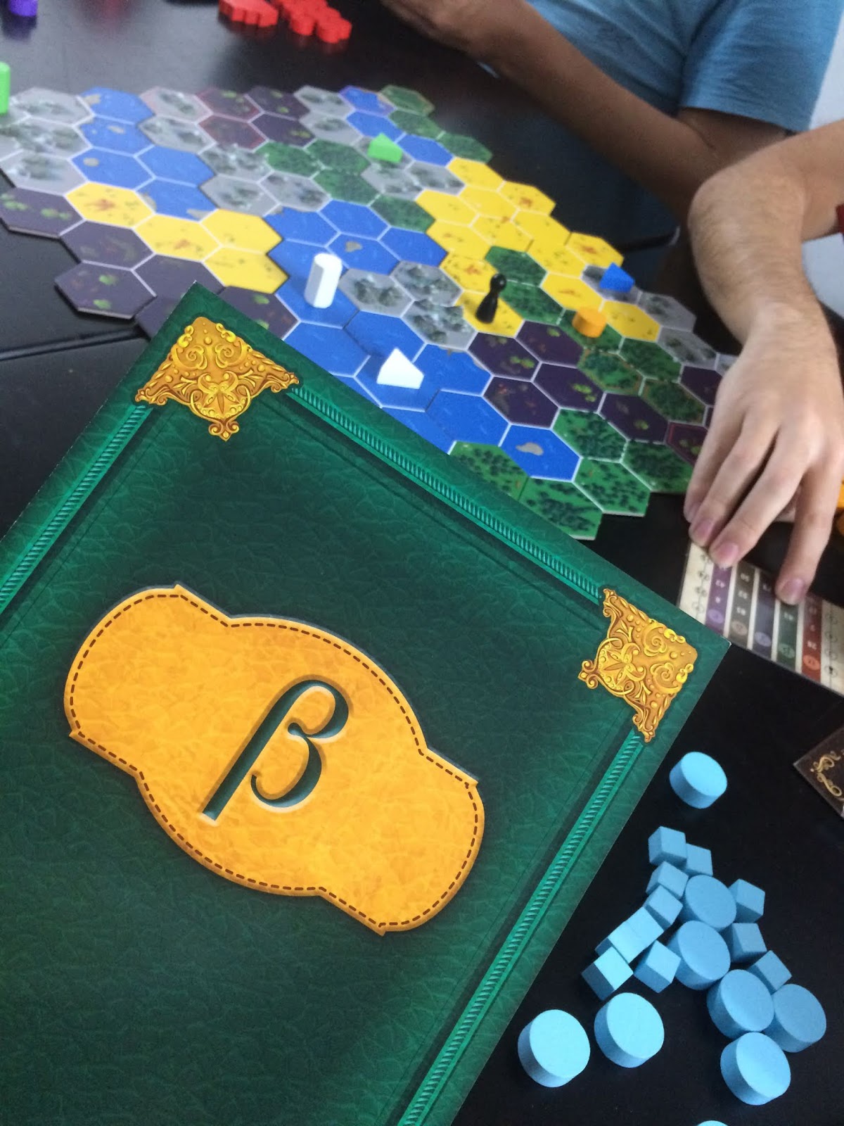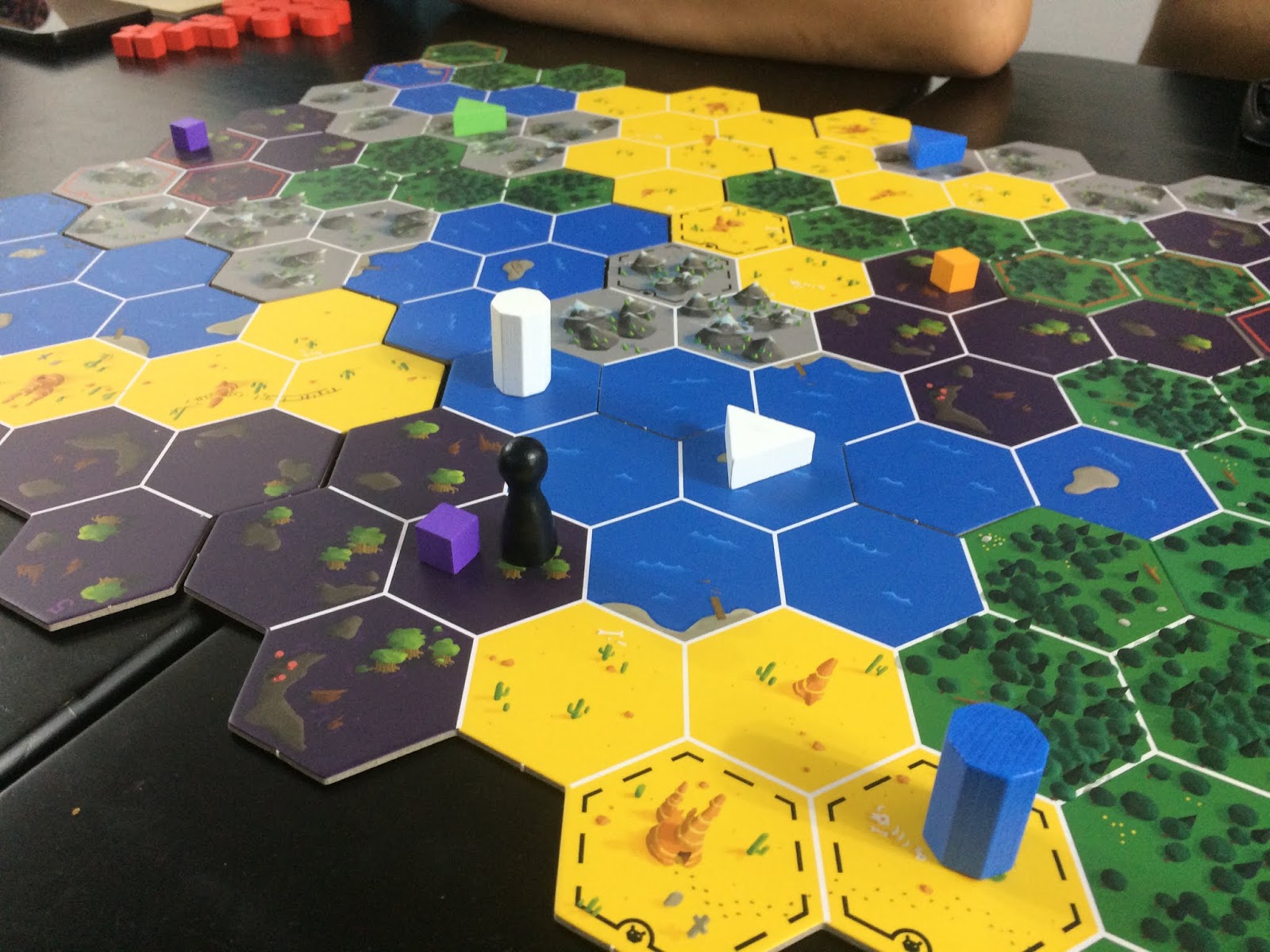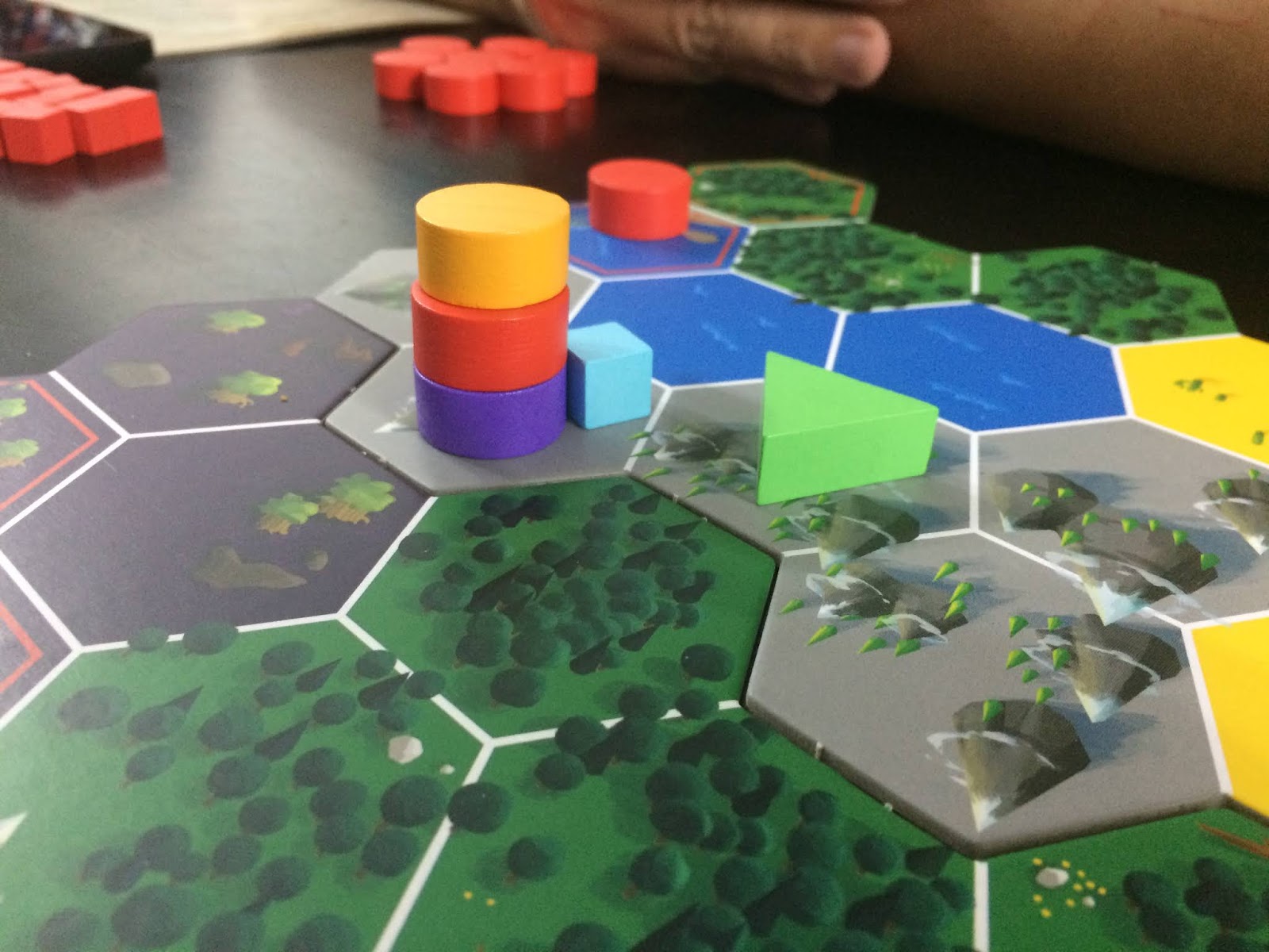 Na ação de procurar um determinado local você vai ser mais incisivo, pegará um dos seus discos e vai escolher um dos hexágonos que você tem certeza que pode ser o habitat da criatura, colocar o seu peão e perguntar aos outros jogadores se ali pode ser o lugar certo, e da mesma forma os jogadores colocarão cubos ou discos para certificar ou derrubar essa hipótese.