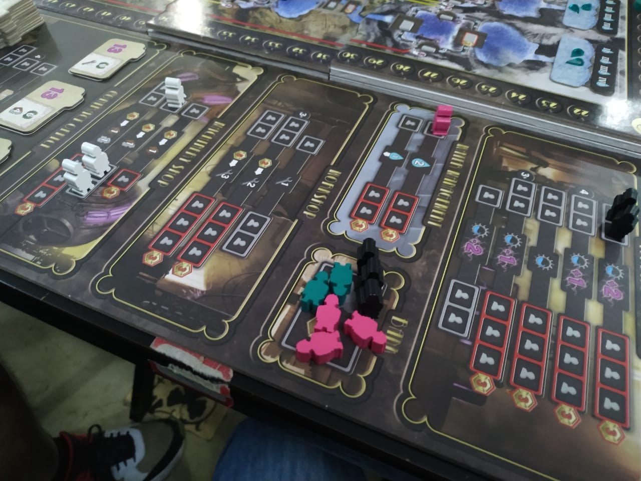 O jogo já começa bem no setup inicial, cada jogador vai receber um board individual onde colocará suas barragens (bases e elevações), suas usinas e seus geradores, além disso recebem recursos, seus engenheiros e um rondel de tecnologia.