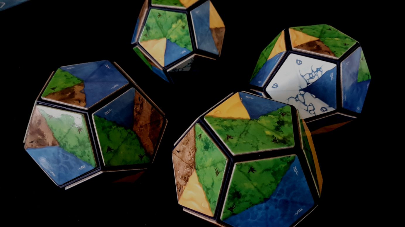 Cada jogador tem um dodecaedro tridimensional (Nota do Sr. Slovic: uma peça de doze lados), que representa um núcleo planetário. Sobre esse núcleo será colocado peças pentagonais (Nota do Sr. Slovic: Tiles com cinco lados), com vários tipos de terrenos (deserto, mares, florestas, geleiras e montanhas). Em cada uma das doze rodadas, um tile será colocado no planeta, conforme a estratégia do jogador. Diferente de jogos como Carcassonne, não há uma regra de vizinhança a ser seguida (Nota da Sra. Slovic: Ou seja, uma geleira pode ser colocada no meio de um vasto deserto).