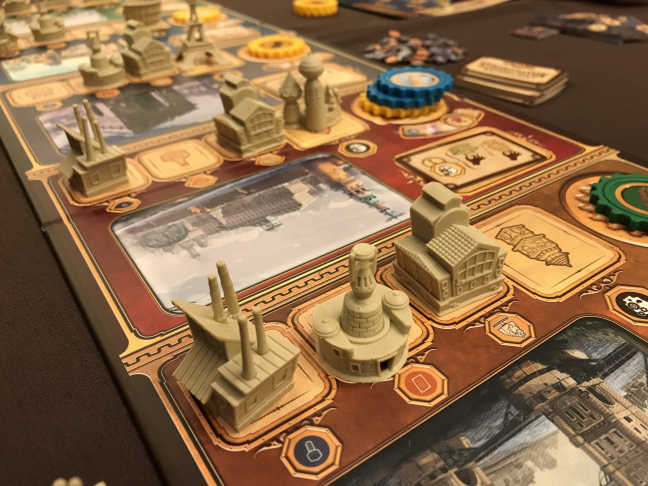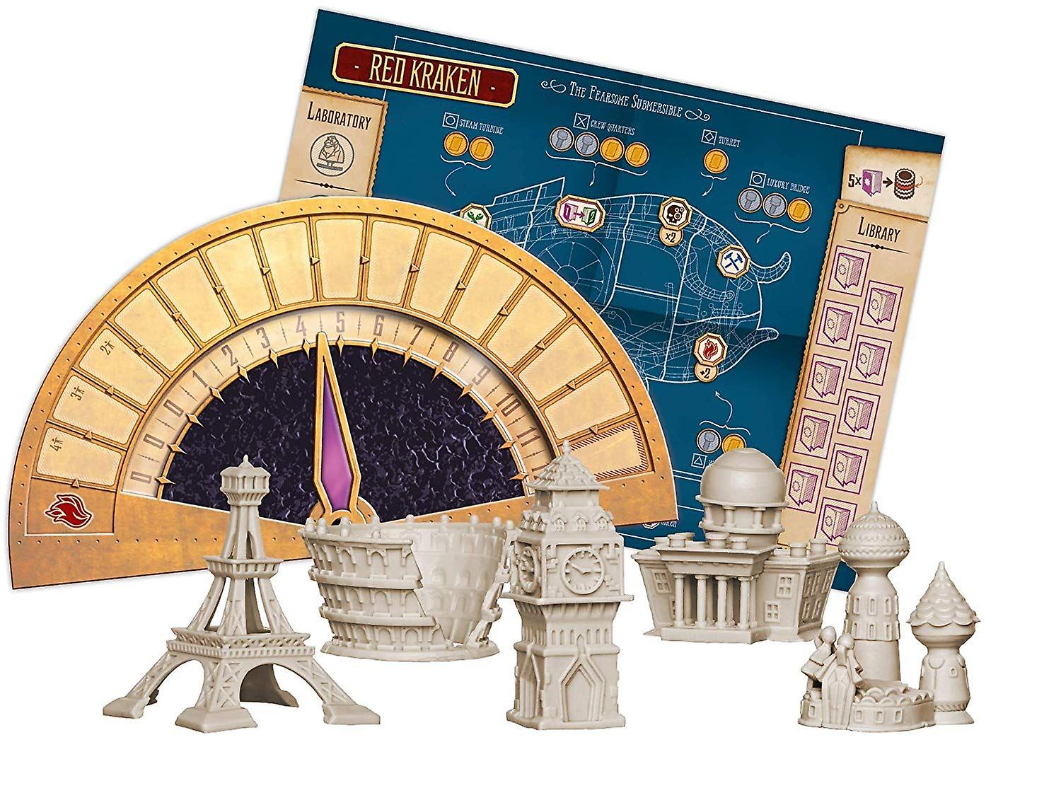 Não, intojo. Nem tem porcas nesse jogo. Vence quem tem mais Pontos de Vilania (PV) e se você correu para completar sua máquina, deixou várias oportunidades de ganhar PVs pelo caminho. E como se ganha PV? É fácil (Nota da Sra. Slovic: Na verdade, nem tanto, mas você entendeu…): completando Missões (com o Segundo em Comando), roubando Prédios e Monumentos (com o Piloto), pegando Códex e fazendo seu “inator”, é claro. Falando de prédios e monumentos, esse é um grande atrativo do jogo. Suas miniaturas são bem legais (nota do Sr. Slovic: E dos cientistas também). É lindo de ser ver na mesa. Para roubar um prédio, o jogador deve ter um Poder de Fogo igual ou maior do que o da Scotland Yard. Sempre que uma construção é surrupiada, o Poder de Fogo dos policiais aumenta em um e, chegando a 12, se torna um gatilho de fim de jogo. Cada prédio roubado (fábrica, fundição e universidade) dá um benefício e os cientistas podem ser usados para conseguir um turno extra, escolher o próximo lacaio a ser usado e até mesmo roubar uma construção independente do poder de fogo.