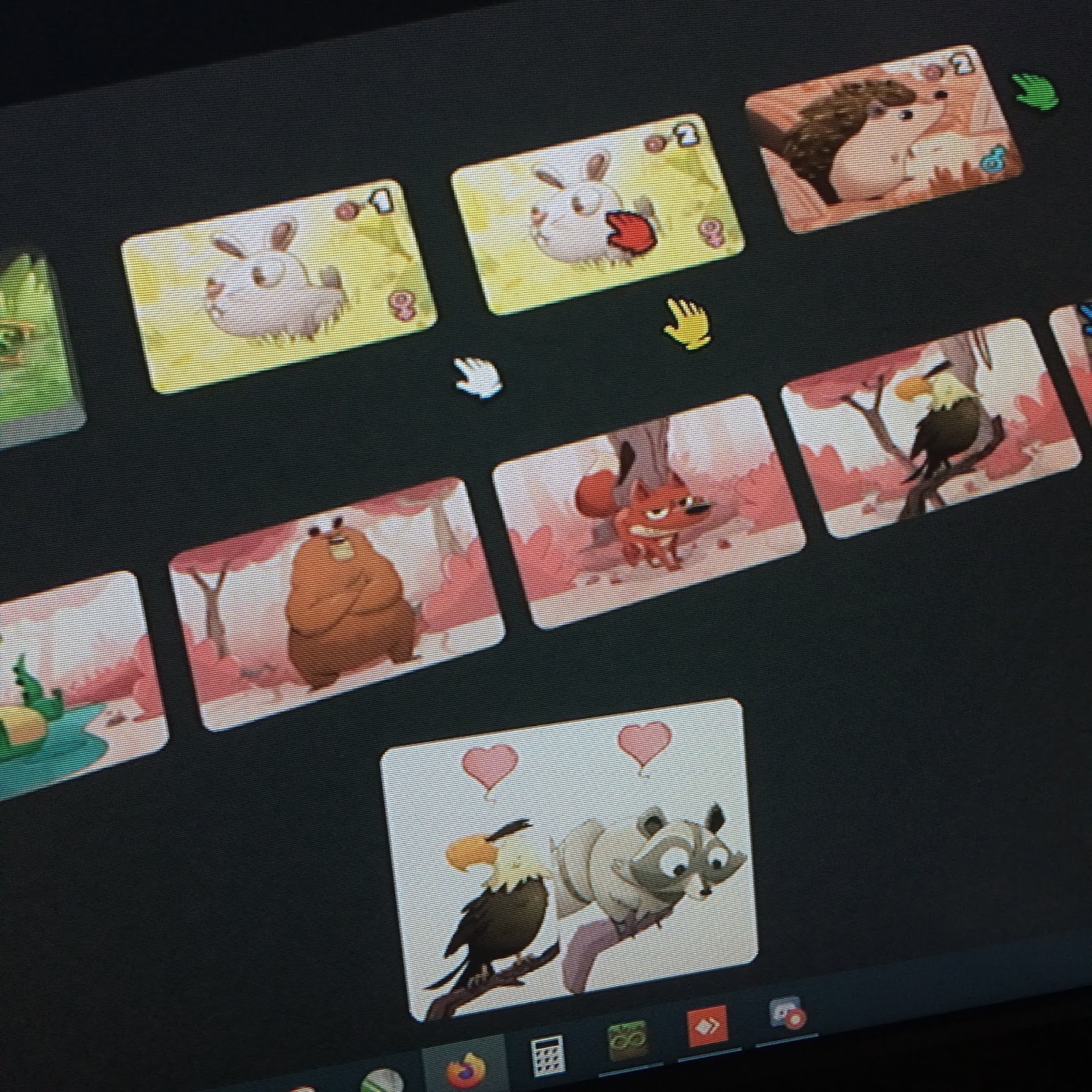 E a pontuação é feita da seguinte forma, cada predador tem fome de 4 pontos, as cartas de presa variam nos valores de 1 a 3, então o jogador na sua vez, escolhe uma das cartas de presa abertas ou uma fechada no topo do baralho, coloca ela em uma das colunas.