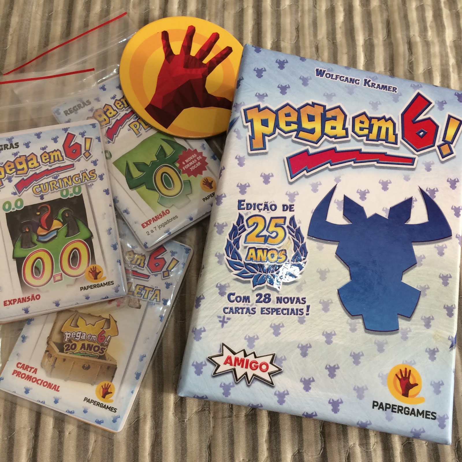 Pega em 6! é daqueles jogos pequenos obrigatórios na sua coleção, ele já teve uma versão brasileira que saiu pela Copag, mas essa versão da Paper Games é a que você precisa, pois como eles trouxeram a edição comemorativa de 25 anos, além do jogo básico ela vem com um monte de pequenos extras para dar uma apimentada num jogo que purinho já é excelente.