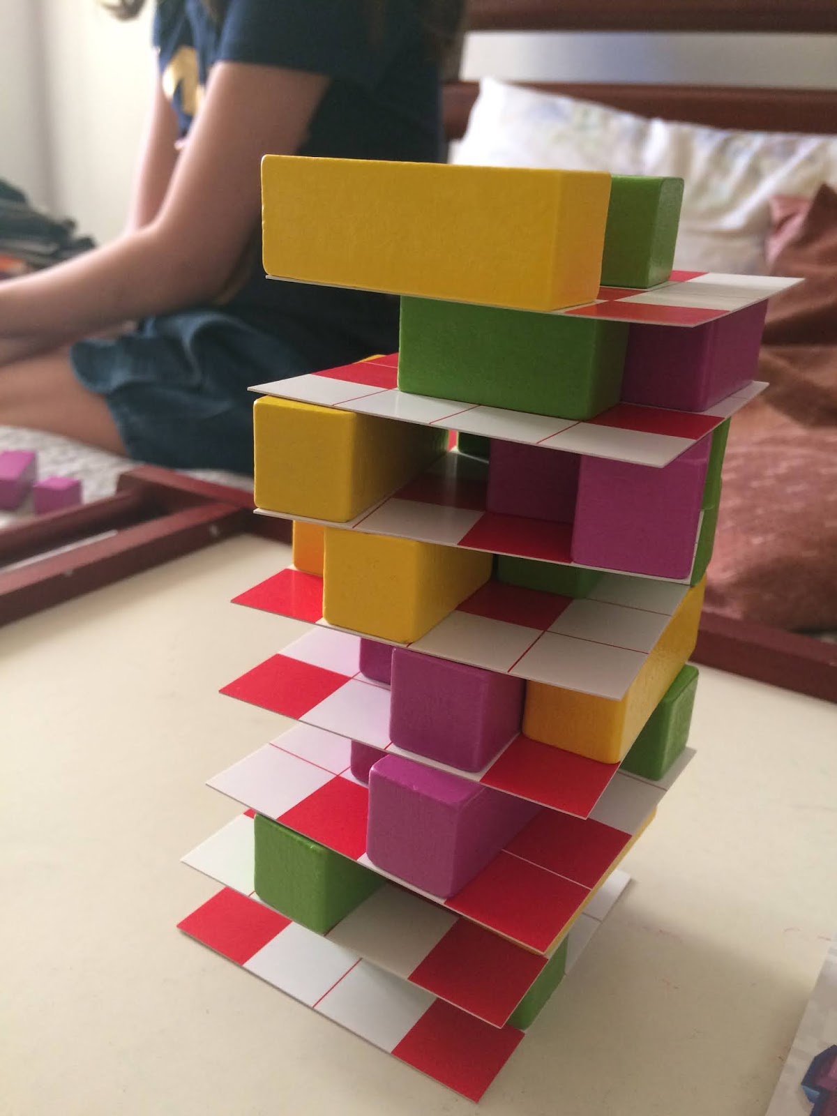 O lance aqui é que a torre tem suas peculiaridades, a base é uma carta com espaços brancos e vermelhos, você precisa que sua peça preencha apenas os espaços brancos, e não pode ter no mesmo andar duas peças pertencentes ao mesmo jogador.