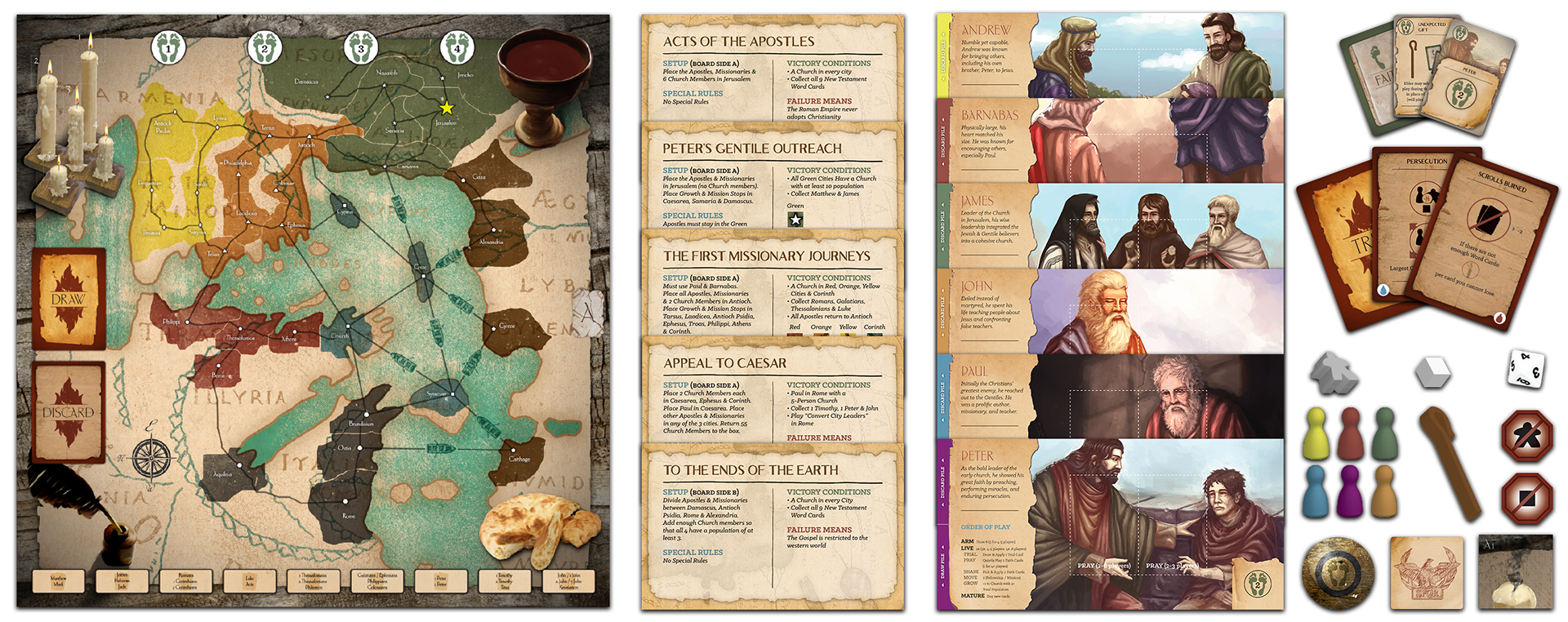 O jogo é cooperativo, quase um anti-pandemic, já que em vez de tirar cubos do tabuleiro, temos que colocar e manter. Cada jogador é um dos seis grandes apóstolos (Nota do Sr. Slovic: Paulo, Pedro, João, André, Barnabé e Tiago. Sim, claro que há outros grandes nomes, mas não daria para colocar todos em jogo, certo?). As ações que se podem fazer são determinadas pelas cartas usadas. No início da partida cada personagem só tem um tipo de carta, mas conforme as rodadas vão avançando, o número e tipos de cartas vão aumentando.