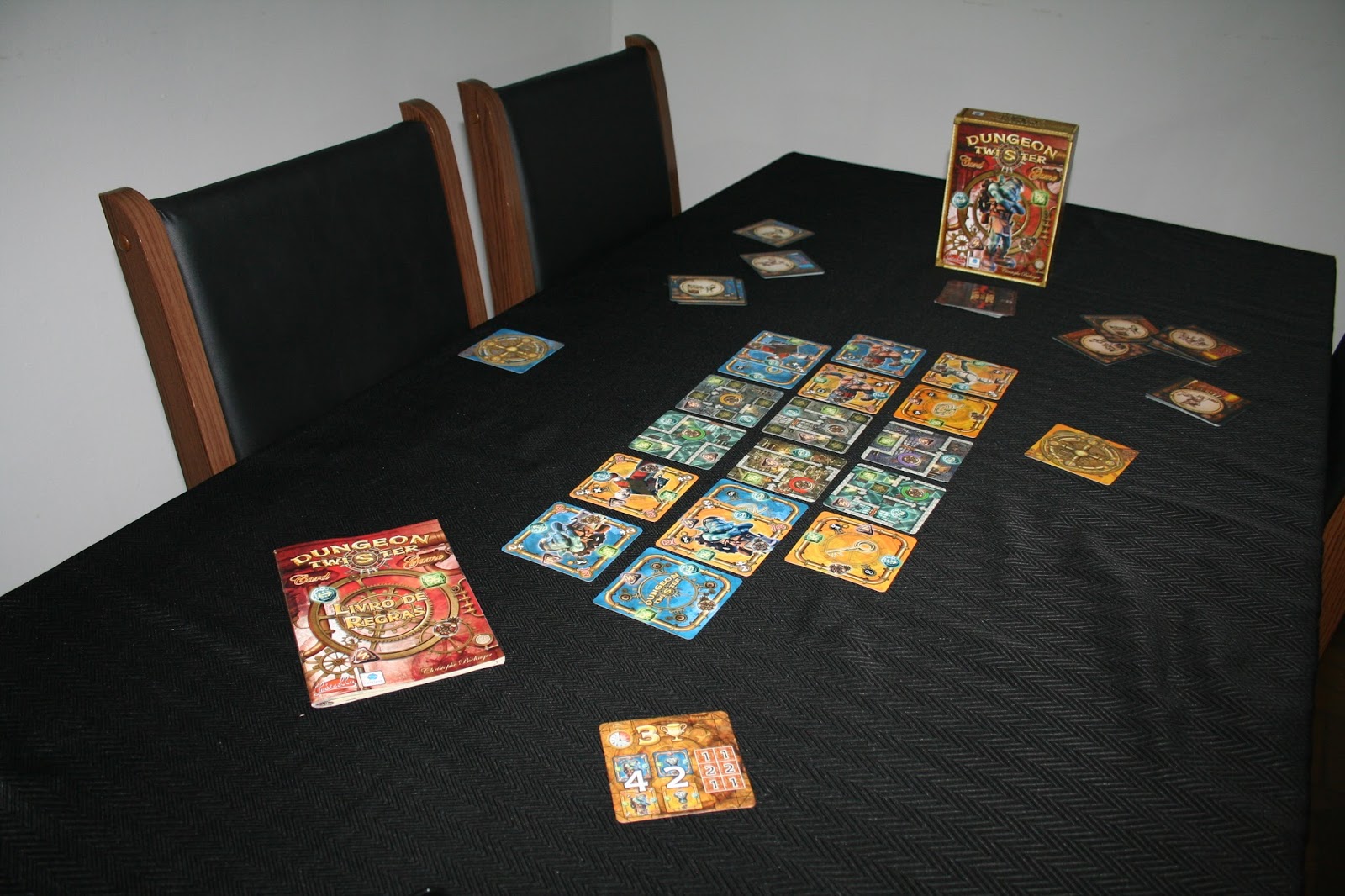 Continuo achando o Dungeon Twister Card Game com uma estética bem desagradável e um tema batido, mas foi a compreensão de sua mecânica aparentemente confusa que me fez enxergá-lo com outros olhos. O jogo é formado apenas por cartas, como já dava para imaginar pelo nome. Existem cartas de masmorra, personagens e itens. As cartas de masmorra são posicionadas em duplas viradas para baixo na mesa, de acordo com a modalidade de jogo escolhida, em cada extremidade os jogadores colocarão dois personagens. Os itens e outros personagens que o jogador venha a ter serão posicionados de maneira intercalada na lateral das cartas de masmorra.