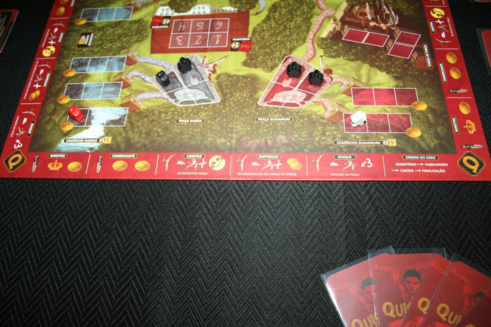 Personagens. Como vcs viram, os personagens são centrais na rejogabilidade de Quissama. Após algumas partidas, fica legal jogar com a variante de menos personagens, forçando os jogadores a variar estratégia. Também as outras, limitando os Escândalos e as Bênçãos Imperiais, tornam as partidas mais disputadas. Interessante mencionarem o Alemão, tanto no texto quando no áudio. Parece que se tornou o mais polêmico dos personagens. Uns acham muito difícil, outros muito fácil, outros simplesmente o ignoram. Como criador, confesso que curto as diversificadas opiniões sobre cada personagem.
