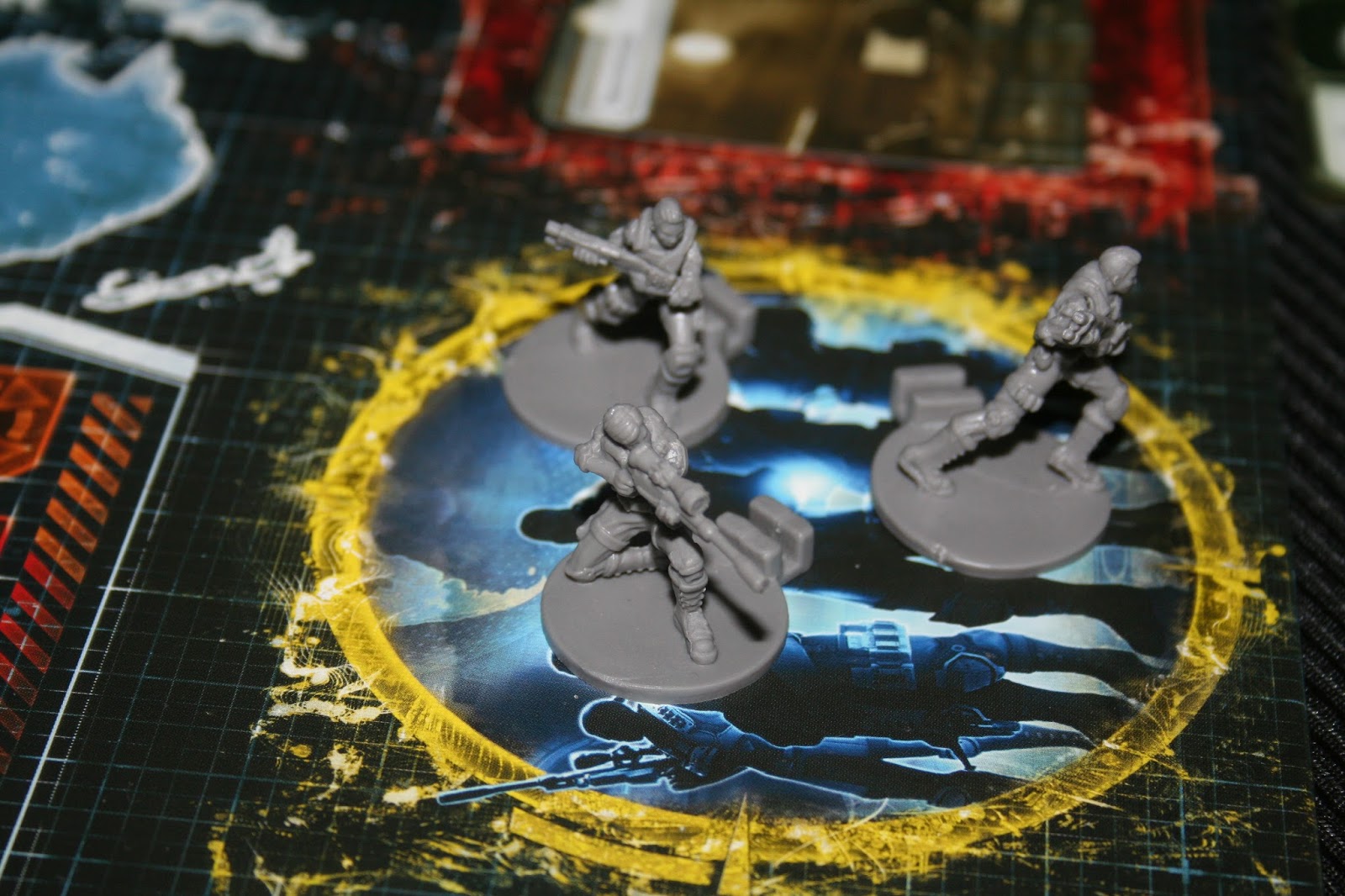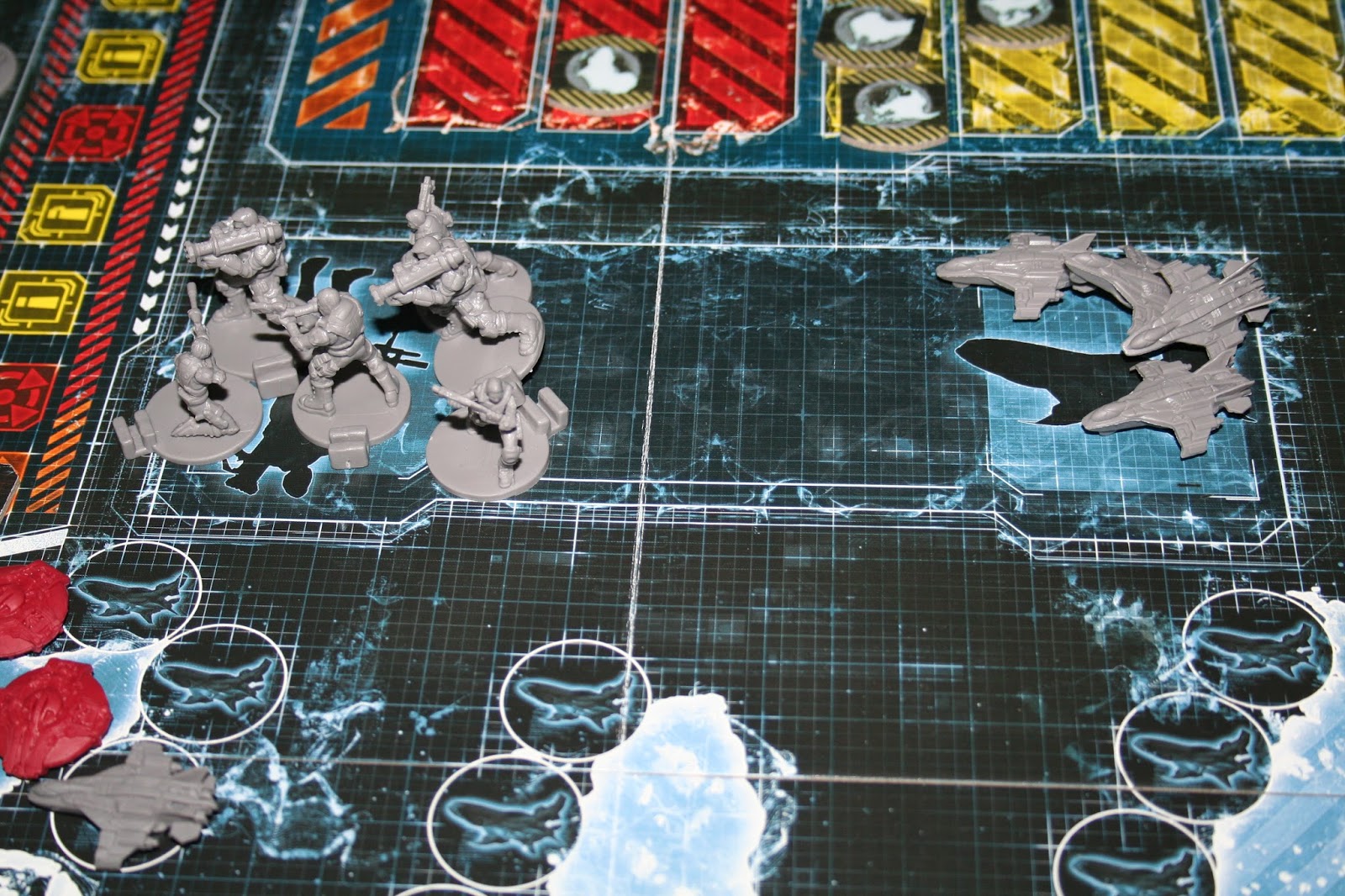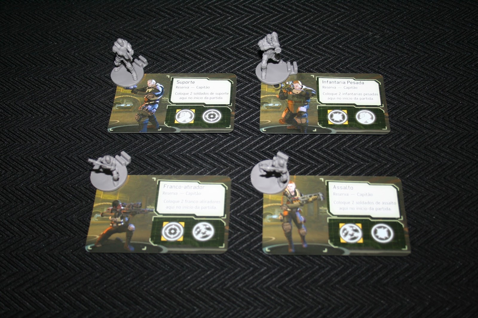 Por último, a função que considero mais difícil - o Capitão. Ele controla as tropas, que devem se dividir entre proteger a base da XCOM e completar as missões. São quatro tipos diferentes de tropas, cada uma começa com dois soldados disponíveis. Eles possuem diferentes tipos de ícones que determinam suas habilidades e especialidade (amarelo) que devem ser correspondentes aos que igualmente são apresentados nas cartas de alienígena e missão. O Capitão geralmente é o cara que recebe mais upgrades, então ele tem muita coisa para administrar. Essa função é o principal motivo de eu ter achado que o jogo só funciona bem com quatro jogadores.