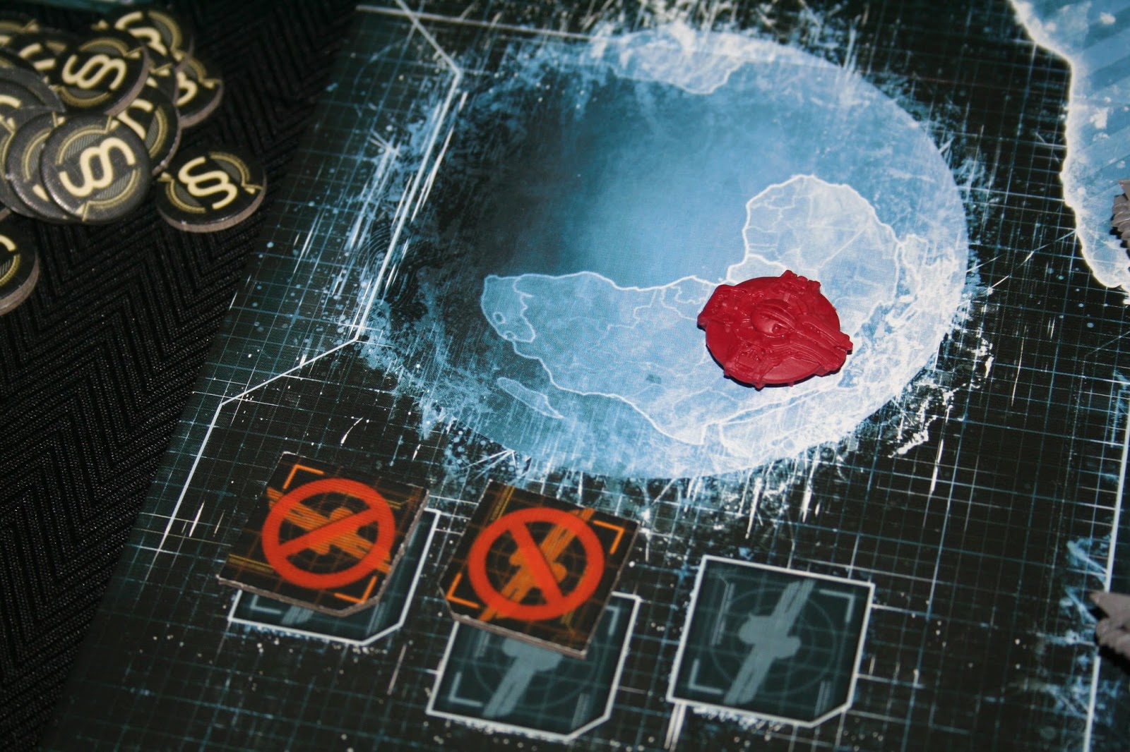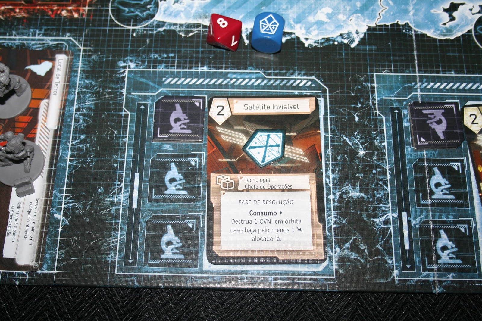 A outra função do jogo é o Diretor de Operações, ele é responsável por colocar os satélites na órbita do planeta. As invasões alienígenas não ocorrem apenas diretamente nos continentes. O jogador que assume essa função também será o responsável por controlar o aplicativo. Afinal, ele é o cara das comunicações. Quando a parada está feia no tabuleiro e ele informa isso no aplicativo, tematicamente funciona como uma falha no sistema de comunicações da XCOM, então a parada fica ainda mais complicada. É uma função mais tranquila em termos de ação no tabuleiro, mas fundamental no jogo.
