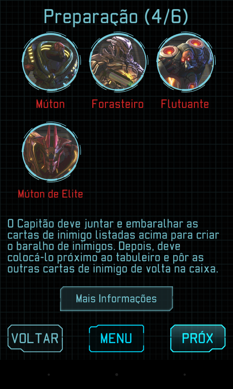 O aplicativo é bem mais que isso, a começar que ele te ensina a jogar. Isso mesmo, o jogo não traz um manual físico como estamos acostumados. O jogador aprende as regras através do aplicativo. Para isso existe a partida de tutorial, também é possível a qualquer momento consultar alguma regra específica que possa ter despertado dúvida. Além do cronômetro de ações, o aplicativo guia a montagem do setup que sempre muda e o andamento da partida de acordo com as situações do tabuleiro, como por exemplo: nível de pânico dos continentes e quantidade de naves alienígenas em jogo.