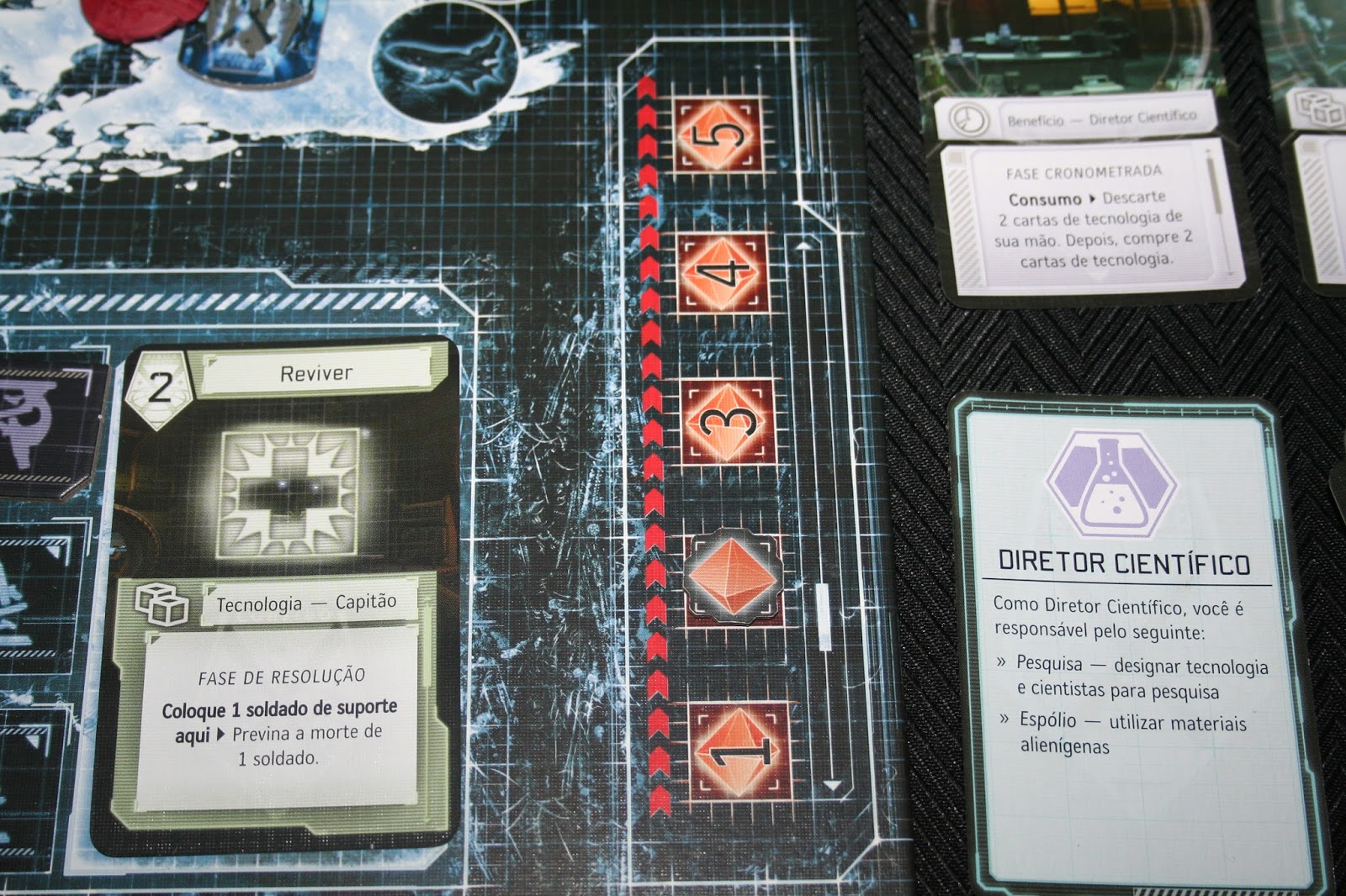 Uma outra função relativamente mais tranquila no jogo é o Diretor Científico. Ele é o cara que vai distribuir os upgrades para a galera. Ele faz isso através das cartas de desenvolvimento tecnológico, com um limite de até três pesquisas simultaneamente e utilizando até três cientistas em cada uma delas. O sucesso é determinado através de rolagem de dados, cada carta tem um valor variável de acordo com o benefício que concede. A quantidade de dados é igual a de cientista utilizados, sendo que temos um D6 com sucesso em apenas duas faces. Junto com o dado da XCOM, é rolado também o D8 alienígena. Não existe limite de rerolagem, mas o marcador de ameaça vai subindo. Se no dado alienígena sair um resultado igual ou menor todos os cientistas morrem.