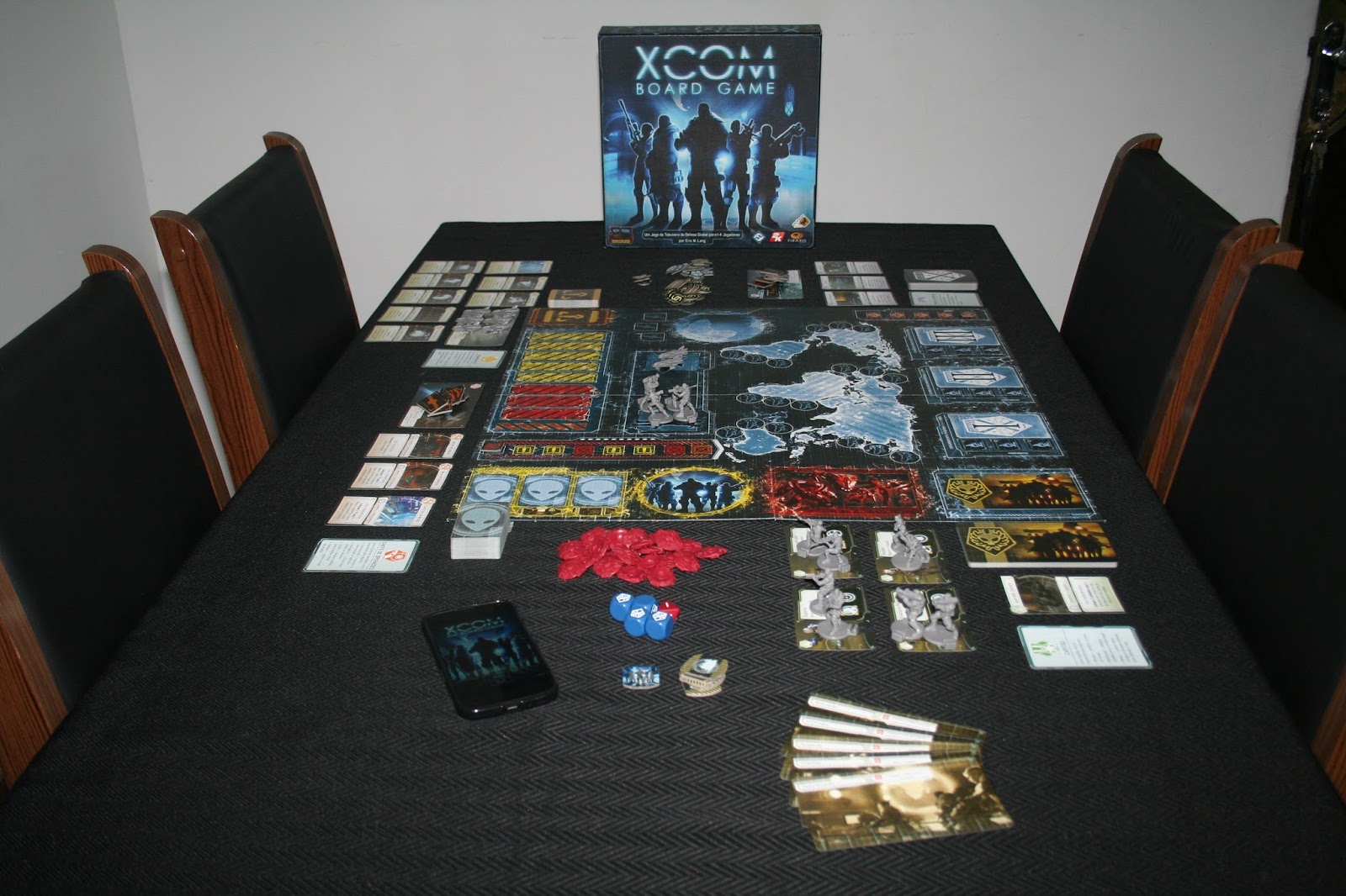 Não conheço os jogos de videogame da franquia, então o texto trata única e exclusivamente da minha experiência com o boardgame. Uma grande polêmica é a dependência do uso do aplicativo. Vi muita gente criticar, alegando que ele controlava o jogador por determinar as ações a serem feitas, o que tornaria o jogo muito burocrático. Quando tive o meu primeiro contato com XCOM, não sabia ainda que o aplicativo era parte tão importante da mecânica. Minha ideia inicial é que seria apenas um contador de tempo para acrescentar um clima de tensão ao jogo, afinal se trata de defender o planeta de uma invasão alienígena.