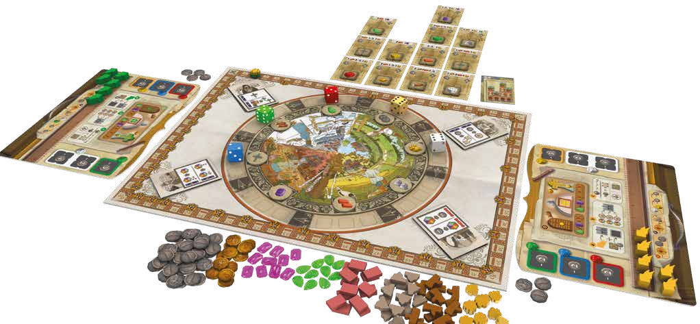 E por último, de acordo com a cor do dado que usamos para mover, se tivermos uma peça de oficina no espaço correspondente daquele dado, ganhamos um bônus, que pode ser a ação do local de um dado de outra cor, ou recursos ou pontos.