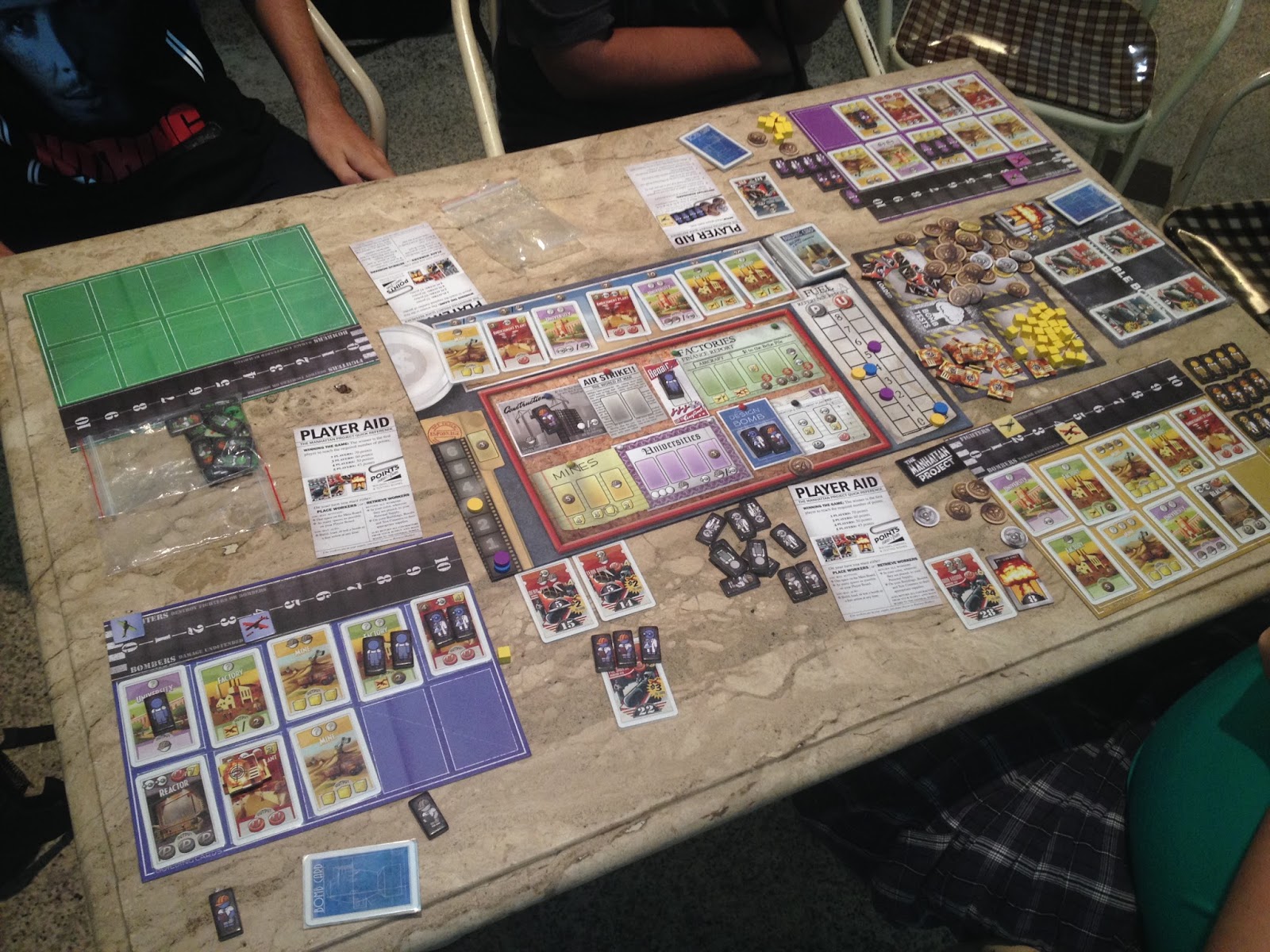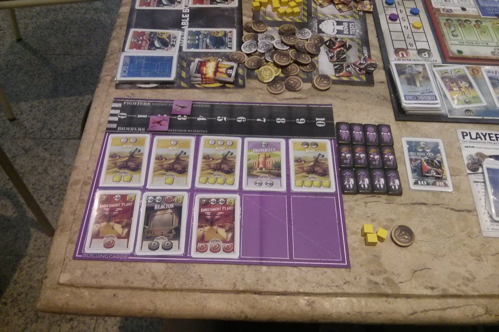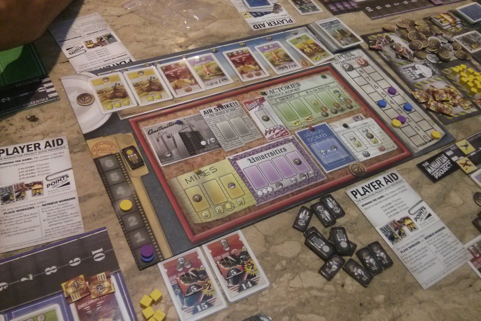 Comecei o dia jogando The Manhattan Project, que eu só conhecia de nome mesmo. Foi uma excelente surpresa, apesar da arte de capa sem graça e que não desperta a vontade de jogar que deveria. Mas os problemas nesse aspecto param por aí, porque os componentes são todos muito bacanas, até o manual que simula a capa de um jornal. O jogo é basicamente um worker placement com temática de construção de bombas atômicas.