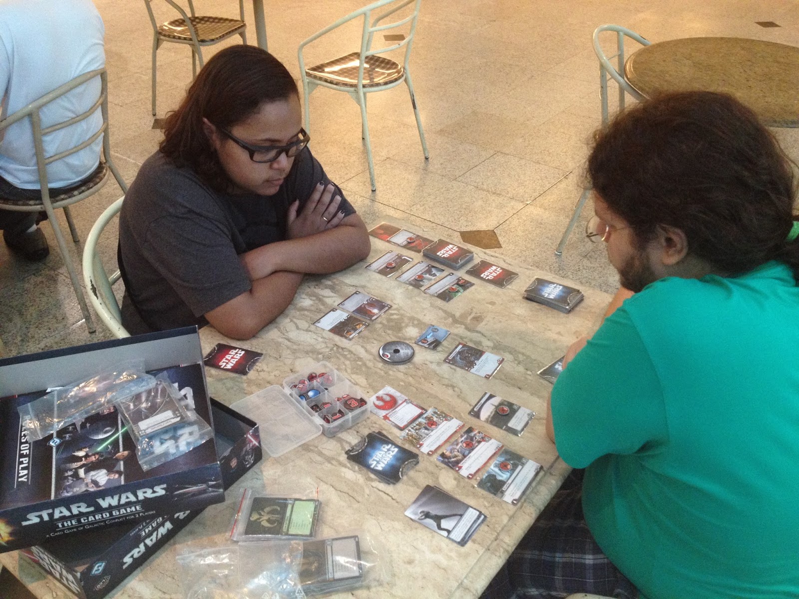 Entre uma partida e outra do The Manhattan Project, joguei Star Wars Card Game com o Cunha. Eu já tinha jogado com o Felipe e não tinha curtido muito, então ficou a dúvida se a gente tinha jogado certo mesmo, já que esse é um jogo tão elogiado. Tínhamos jogado certo sim e eu que realmente não gostei mesmo. Talvez a curva de aprendizado dele seja um pouco alta e isso tenha atrapalhado a minha apreciação, ele pareceu depender da capacidade do jogador de formar os combos certos mais do que normalmente já se vê em outros jogos do estilo.