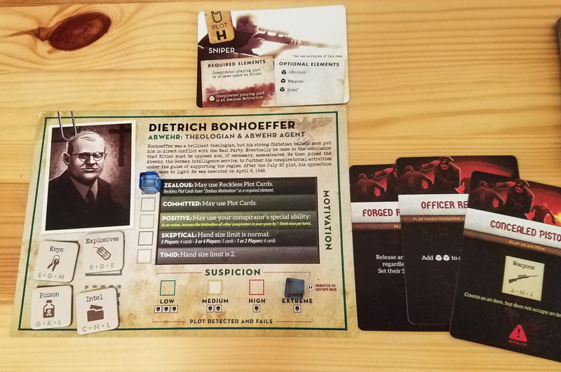 Durante seu turno o jogador pode fazer até ações, sendo que uma delas, Conspirar, pode conceder ações extras, mas também pode te colocar na mira da Gestapo (Nota do Sr. Slovic: A temível e implacável polícia secreta nazista), que pode te prender sem motivo algum e torturar, do mesmo jeito que faziam (Nota do Casal Slovic: E ainda fazem) em regimes ditatoriais. Para o plano ser executado, primeiro deve haver um plano! Sempre depois de realizar suas ações, o jogador compra Cartas de Conspiração, que podem ser ações extras bem úteis, equipamentos especiais (Nota da Sra. Slovic: E normalmente proibidos, então não deixe a Gestapo te pagar com isso em mãos) e vários tipos diferentes de planos, que vão desde o sequestro, até atentados a bomba e comida envenenada. A Carta de Plano indica quais materiais são necessários e onde Hitler deve estar.
