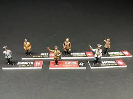 Claro que sim, du naiver shuth. Não só ele, como os principais integrantes da cúpula Nazista estão no jogo: Goebbels, Himmler, Göring, Hess e Bormann andam pela Europa e se algum jogador começar sua rodada na mesma cidade de um deles, recebe uma penalidade, que depende de quem esteja la. E os eventos são acumulativos; se mais de um líder nazista estiver no local (Nota do Sr. Slovic: E é possível todos estarem juntos). A movimentação dos nazistas se dá através das Cartas de Evento, que são resolvidas no fim de rodada de cada jogador. As cartas são eventos históricos, que indicam se houve alguma movimentação dos líderes e/ou alguma alteração de regras ou condições na próxima rodada. Quando um deck de eventos acaba, começa o próximo turno e como alguns eventos fazem cartas serem descartadas, não dá para saber quantas rodadas há até o fim do turno. A partir do segundo deck, começam a aparecer as cartas de Gestapo, que fazem os jogadores com alto nível de suspeita serem presos. Na prisão, os jogadores podem ser torturados, fazendo até entregar os companheiros. A fuga a prisão é possível e necessária, pois se todos os personagens estiverem encarcerados, o jogo termina.