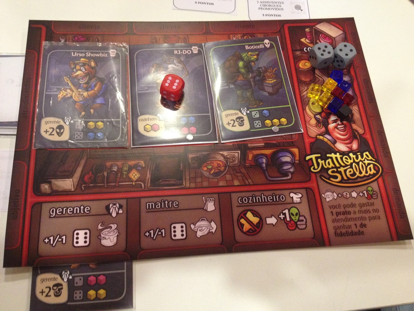 Minha habilidade era modificar o dado em dois gastando um recurso, então foquei mais em atender os clientes com prontidão e, de preferência, aqueles que tivessem estrelas. Tanto que passei um bom tempo do jogo na frente. Optei por não promover funcionários, vendi bastante nos primeiros turnos quando eles valem mais, pois não queria chegar no final tendo que perder dinheiro pagando salários. Só que depois, comecei a ter dificuldade para produzir os recursos, precisava acumular muito para atender os clientes dentro do turno e ficar mudando os dados. Tinha um objetivo de atender seis clientes disponível na mesa, fiquei travada no quinto. Quem ganhou a partida foi o Lucas (ilustrador do jogo) e eu fiquei em segundo, então foi como se eu tivesse vencido. O restaurante dele tinha uma habilidade muito boa de limpar marcadores de insatisfação.