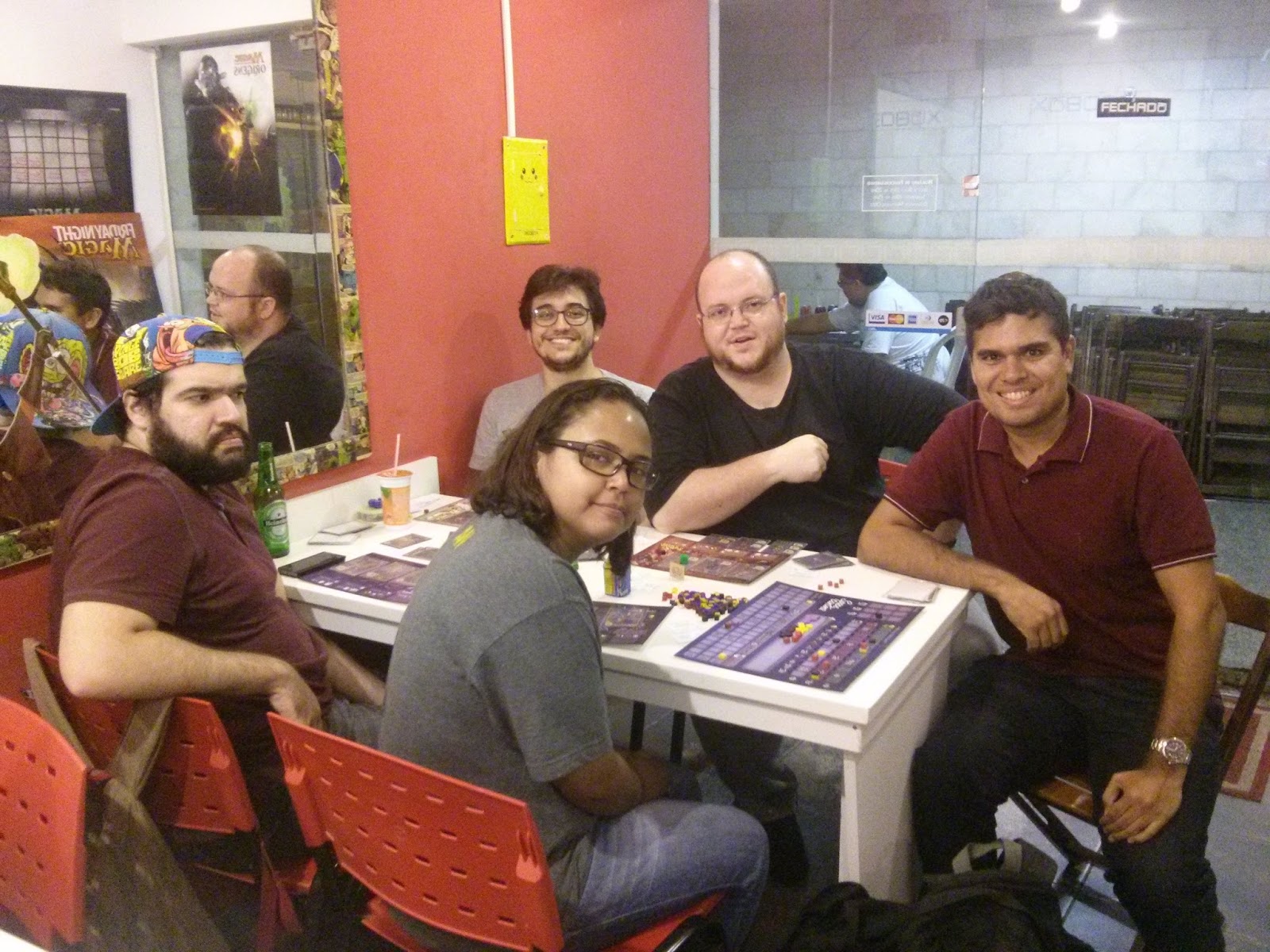 Minha habilidade era modificar o dado em dois gastando um recurso, então foquei mais em atender os clientes com prontidão e, de preferência, aqueles que tivessem estrelas. Tanto que passei um bom tempo do jogo na frente. Optei por não promover funcionários, vendi bastante nos primeiros turnos quando eles valem mais, pois não queria chegar no final tendo que perder dinheiro pagando salários. Só que depois, comecei a ter dificuldade para produzir os recursos, precisava acumular muito para atender os clientes dentro do turno e ficar mudando os dados. Tinha um objetivo de atender seis clientes disponível na mesa, fiquei travada no quinto. Quem ganhou a partida foi o Lucas (ilustrador do jogo) e eu fiquei em segundo, então foi como se eu tivesse vencido. O restaurante dele tinha uma habilidade muito boa de limpar marcadores de insatisfação.