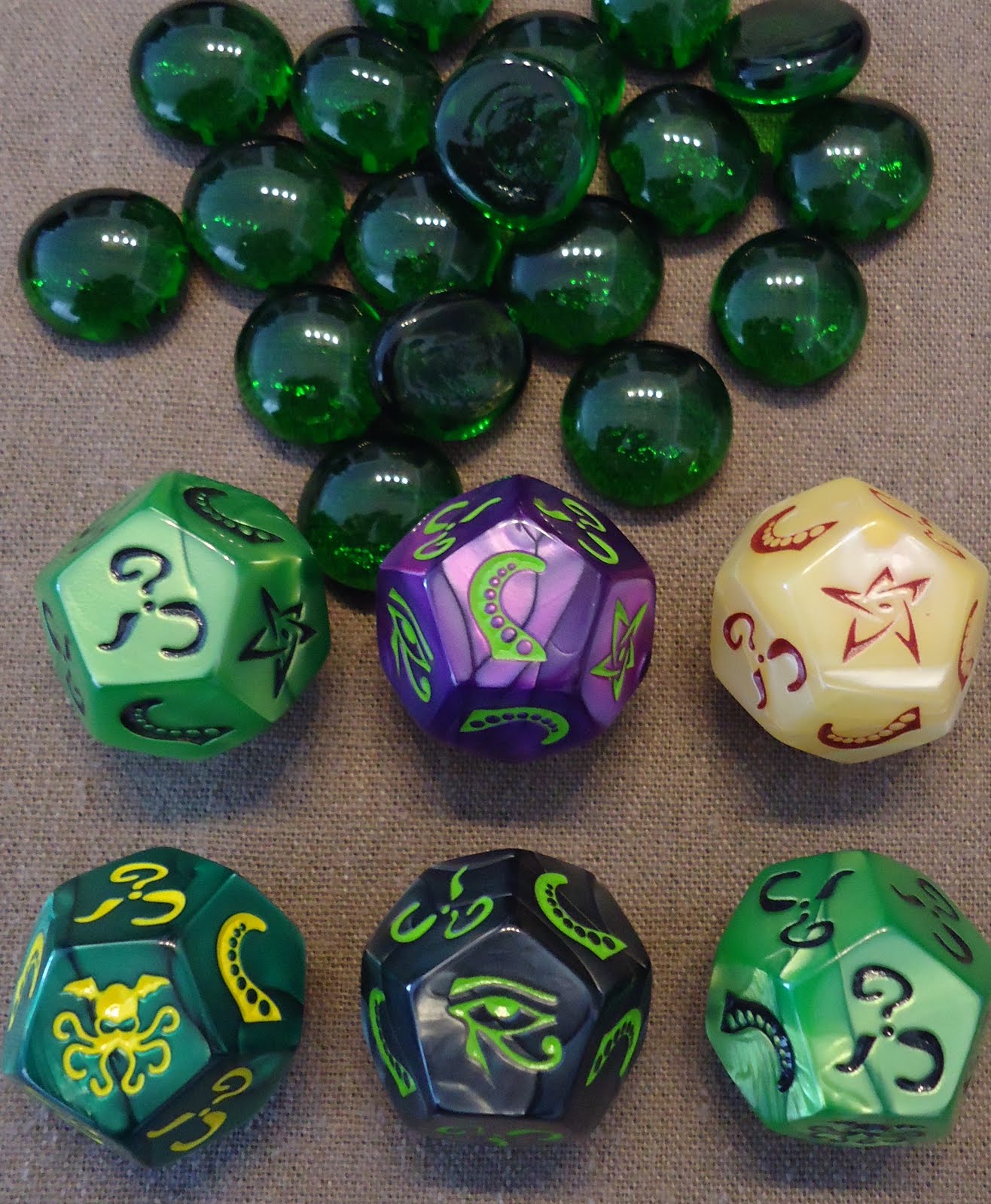 Assim como você, doido de pedra. Cada jogador tem três Pontos de Sanidade (Nota da Sra. Slovic: Que são belas contas coloridas. As nossas são verdes), na sua vez joga um dado de doze lados (Nota do Sr. Slovic: Também conhecido como dodecaedro ou D12) e faz a ação correspondente a face do dado, que pode ser: perder, ganhar ou roubar sanidade. Vence o último que tiver alguma sanidade na mesa. Se todos ficarem sem sanidade ao mesmo tempo, Cthulhu vence.