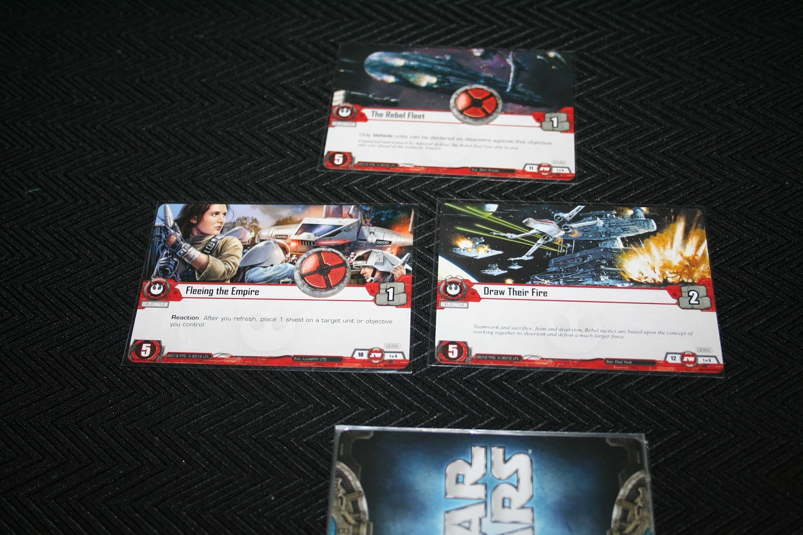 O jogo é um pouco assimétrico nas condição de vitória. O lado da luz vence se destruir três objetivos, já o lado negro vence se o contador da estrela da morte chegar a doze pontos ou se o oponente não tiver mais objetivos para comprar. São três os objetivos que devem ficar abertos de cada lado. Eles dão os recursos para baixar as cartas e alguns concedem benefícios adicionais, além de virem com os pontos de vida. Saber combinar os objetivos é muito importante, nesse sentido achei o deck Rebelde absurdo nos combos dos objetivos.