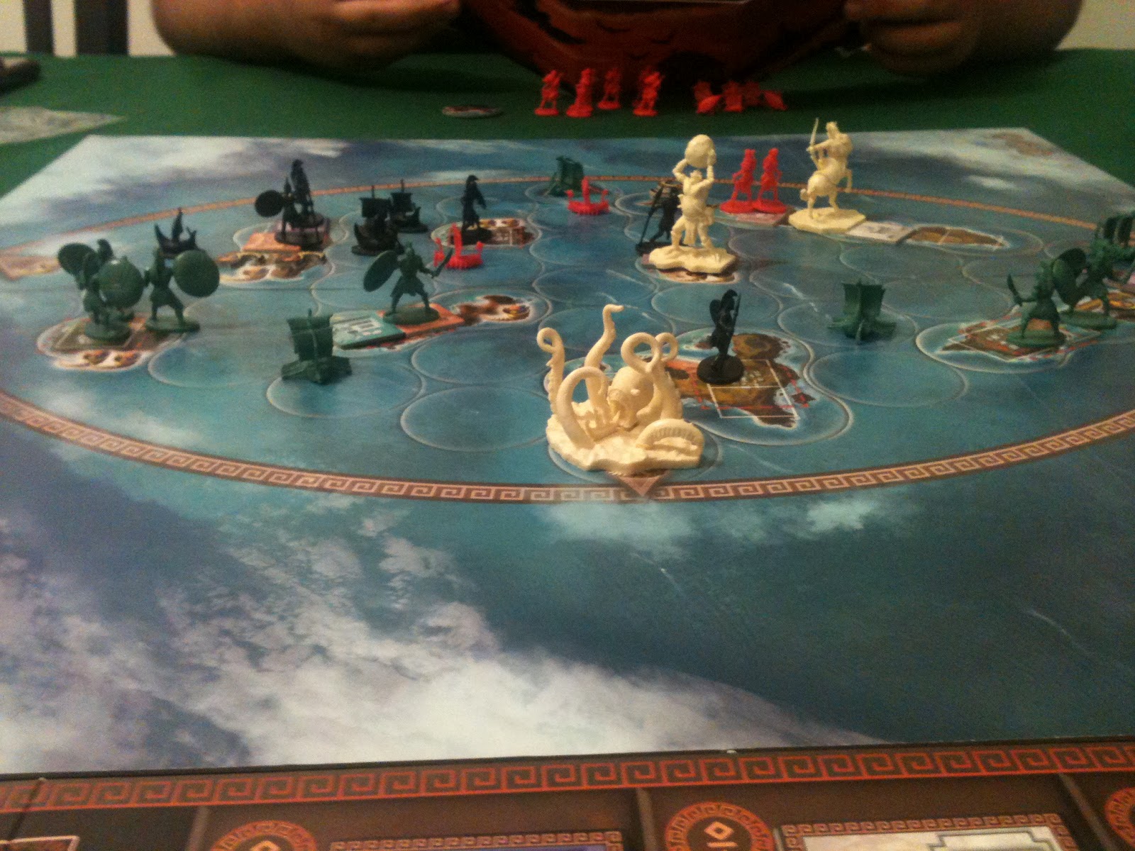 Para a partida de estreia do Cyclades, jogaram eu, o Joca e o Henrique. O jogo foi muito disputado, onde todos tiveram chance de vencer. O Joca, apesar de possuir somente 1 ilha no final, conseguiu conquistar uma ilha vizinha e ganhar o jogo. Boa jogatina com muita estratégia.
